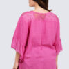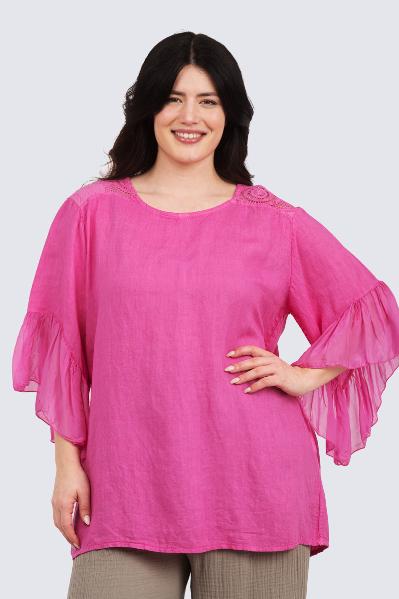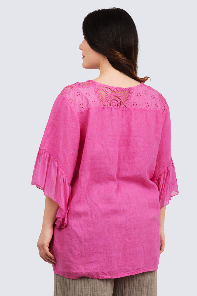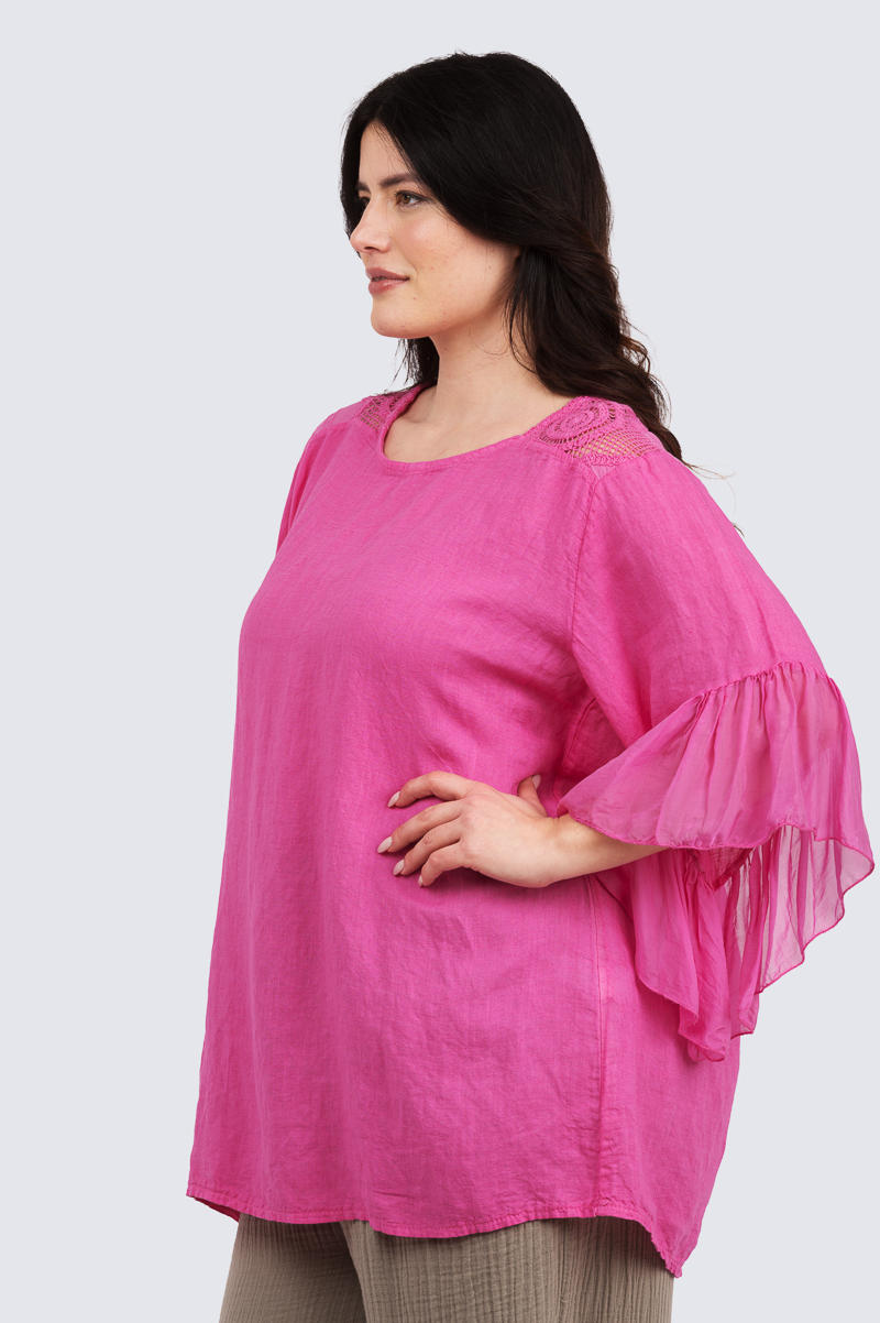 Aino pellavapuseron herkät hihat, sekä hartiaseudun ja niskan kaunis pitsi on tämän pitkän pellavapuseron upeita yksityiskohtia.