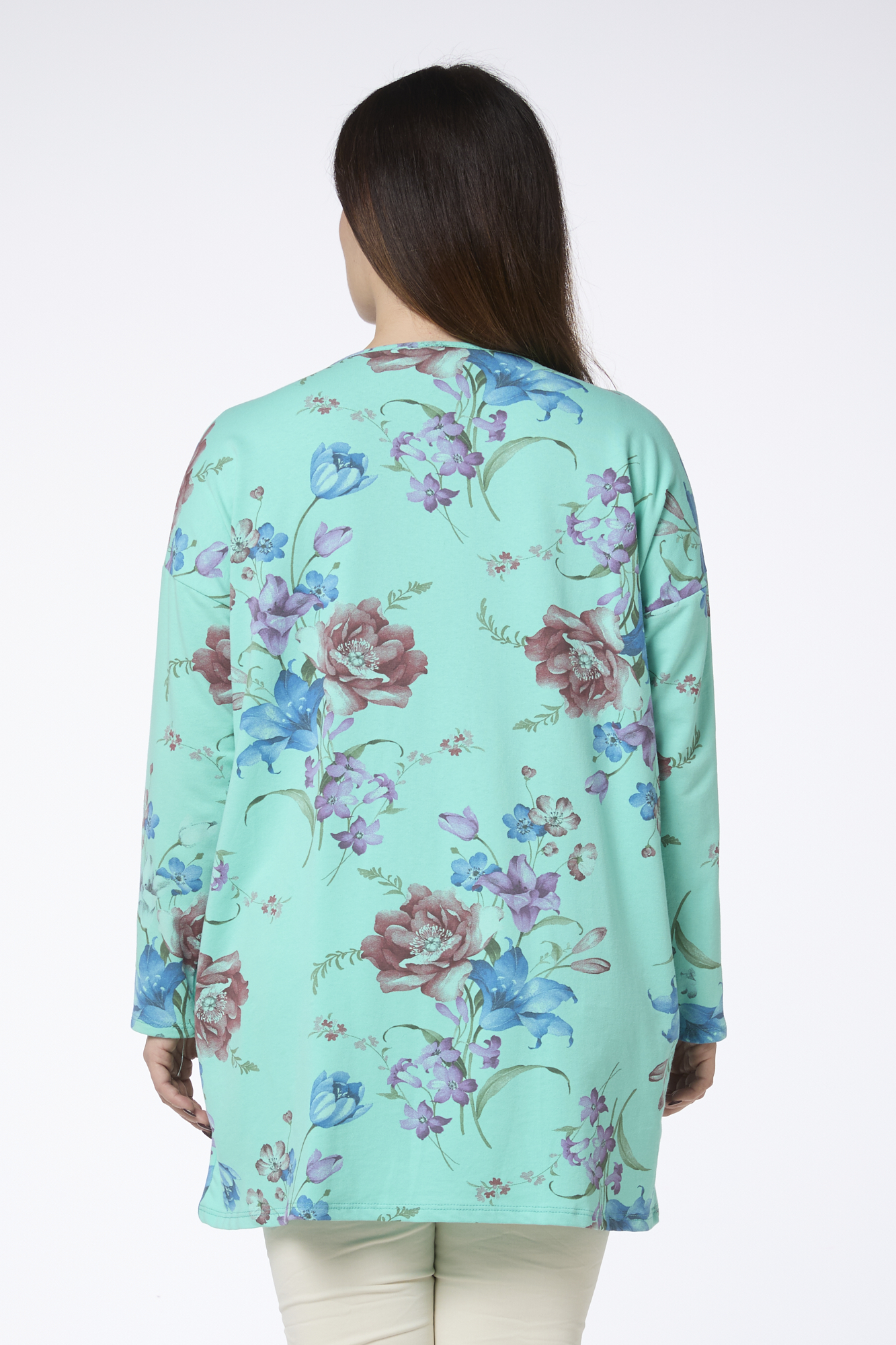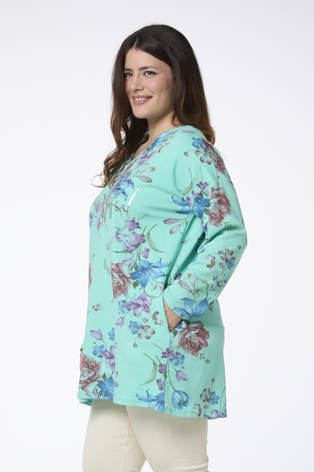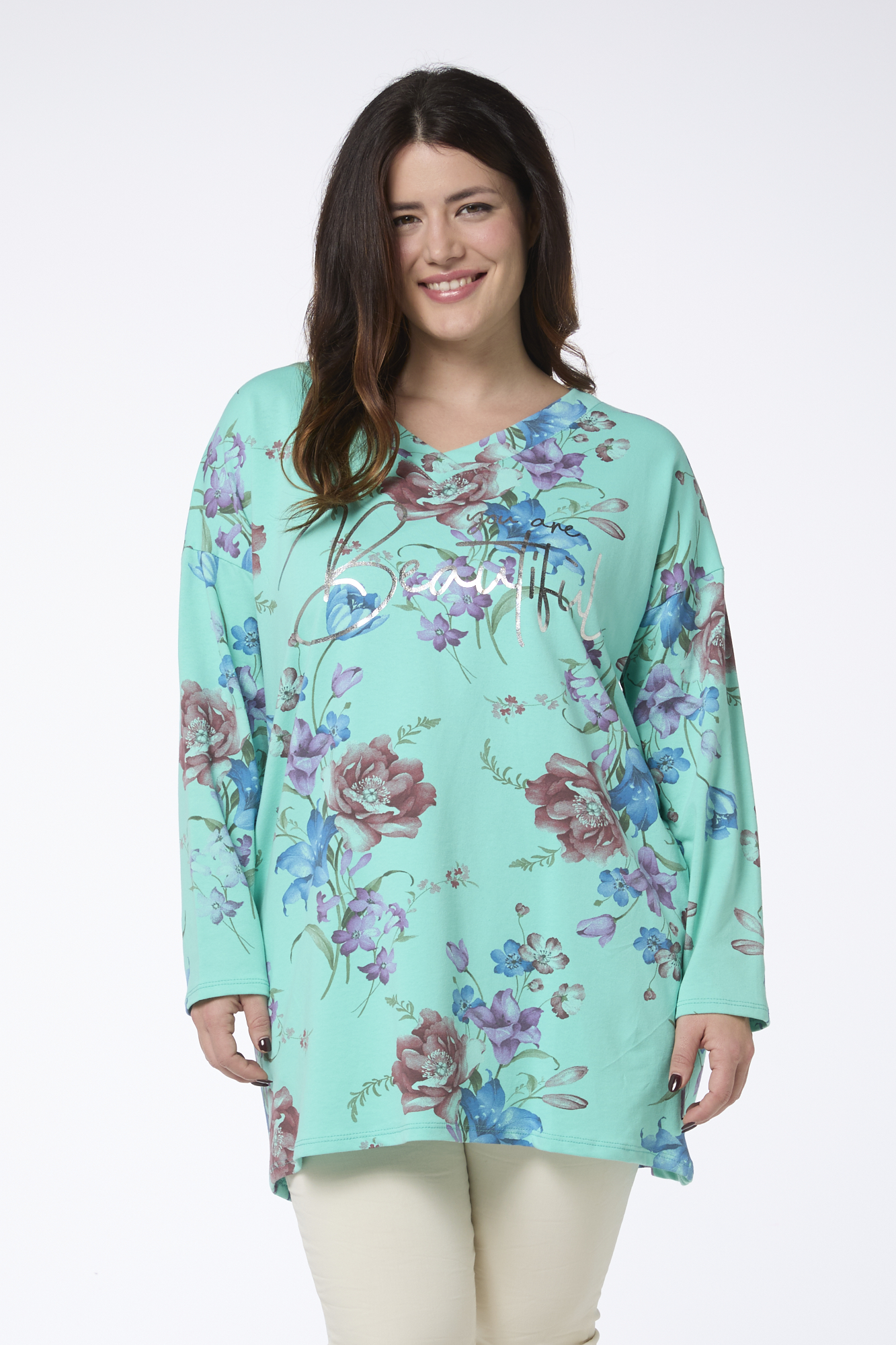 Napakka collegetunika kukkakuosilla. V-aukko, sivusaumoissa taskut ja edessä hennosti hopealla teksti: You are beautiful