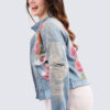 Tämä farkkutakkia jäljittävä bohemi pikku jakku on printattu upein kuvioin. Myös takin kulumat reiät ja brodeerauskuviot helmineen tovat printattuja. Taskut edessä ja helman etuosa on kuorrutettu sinisin paljetein. Takki on liukaspintaista ja pehmeää materiaalia