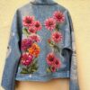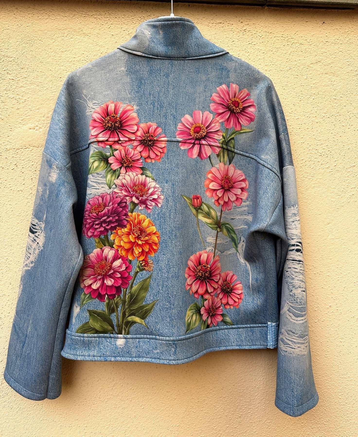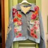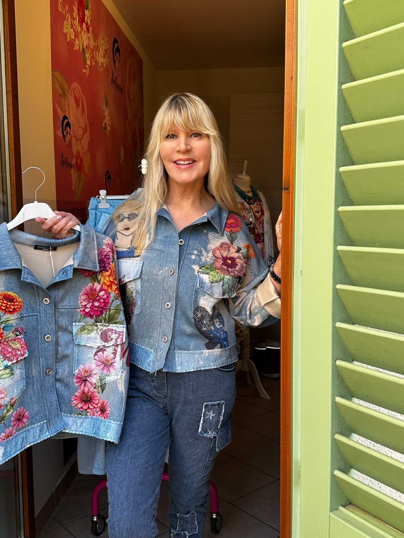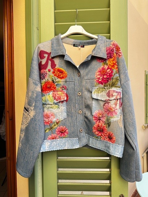 Tämä farkkutakkia jäljittävä bohemi pikku jakku on printattu upein kuvioin. Myös takin kulumat reiät ja brodeerauskuviot helmineen tovat printattuja. Taskut edessä ja helman etuosa on kuorrutettu sinisin paljetein. Takki on liukaspintaista ja pehmeää materiaalia