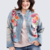 Tämä farkkutakkia jäljittävä bohemi pikku jakku on printattu upein kuvioin. Myös takin kulumat reiät ja brodeerauskuviot helmineen tovat printattuja. Taskut edessä ja helman etuosa on kuorrutettu sinisin paljetein. Takki on liukaspintaista ja pehmeää materiaalia