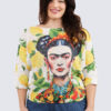 Pirteä sitruunakuvioinen neule Frida Kahlon kuvalla