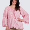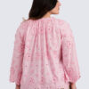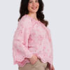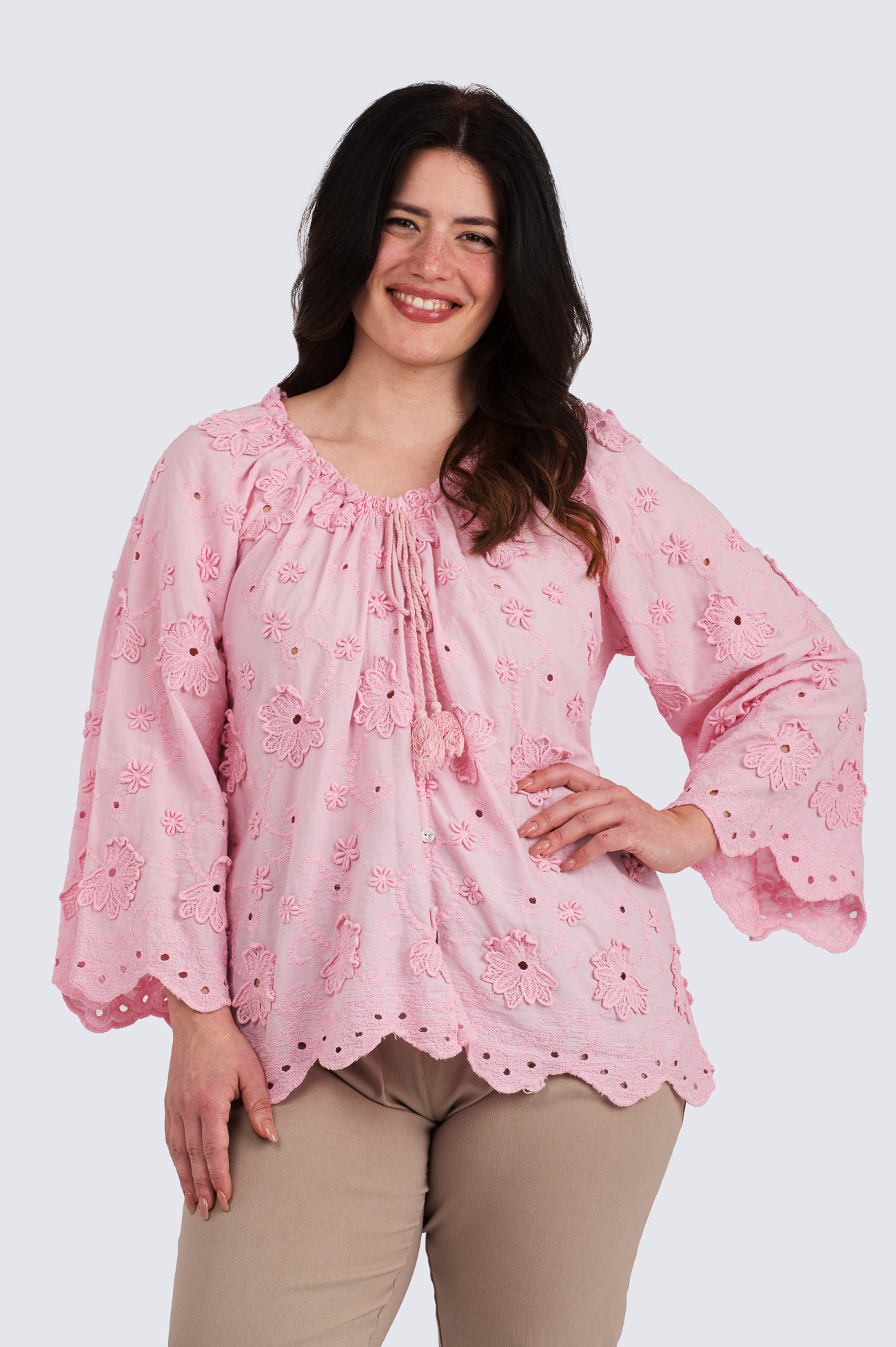 Brodeerausta, eylet pitsiä ja kolmiulotteista kukkaa. Kaula-aukossa on kuminauha, edessä nyörit ja helmiäisnapit koristeena.
