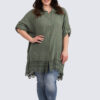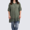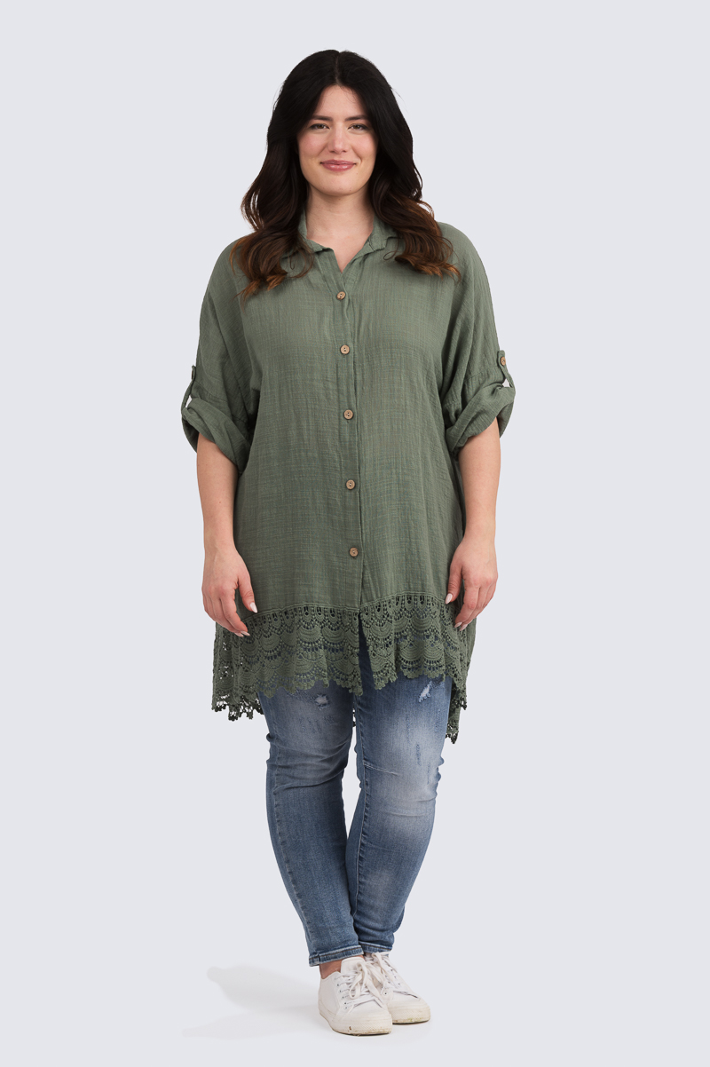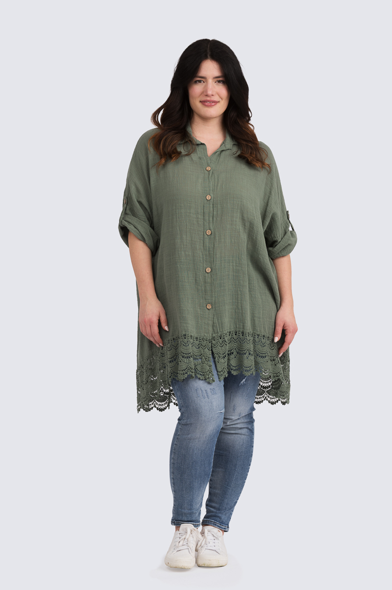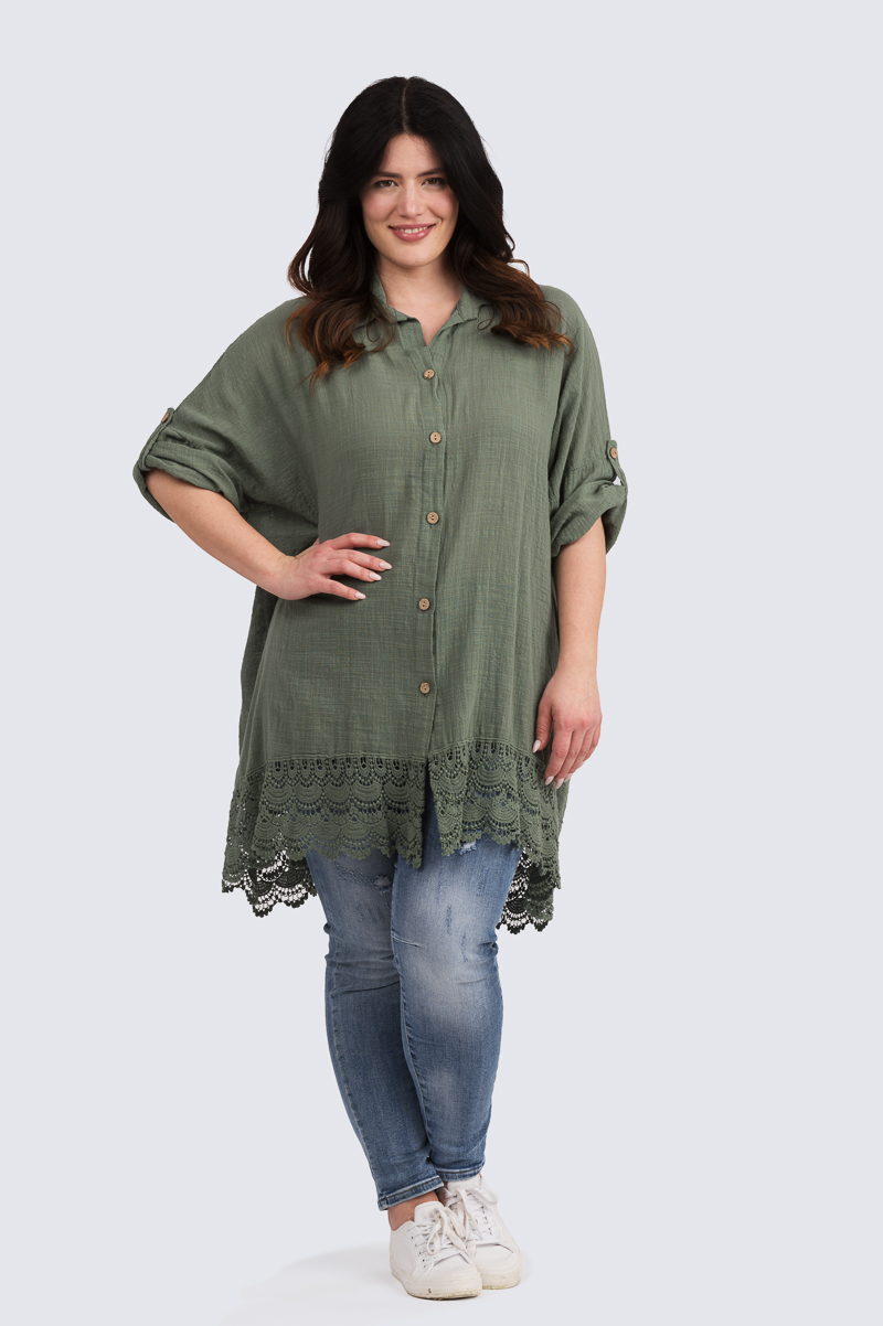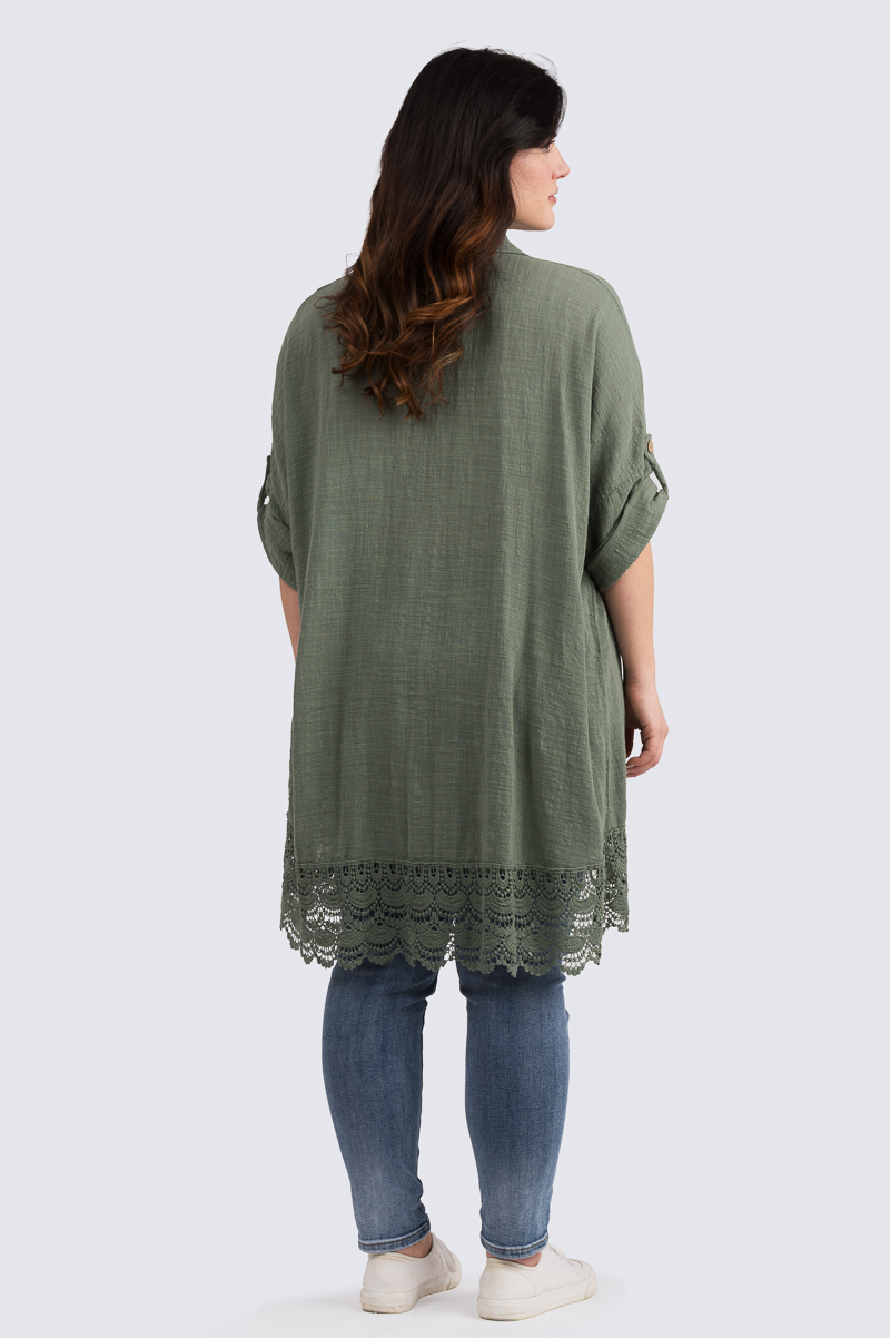 Käytännöllinen ja rento pitkä paitis pitsihelmalla.