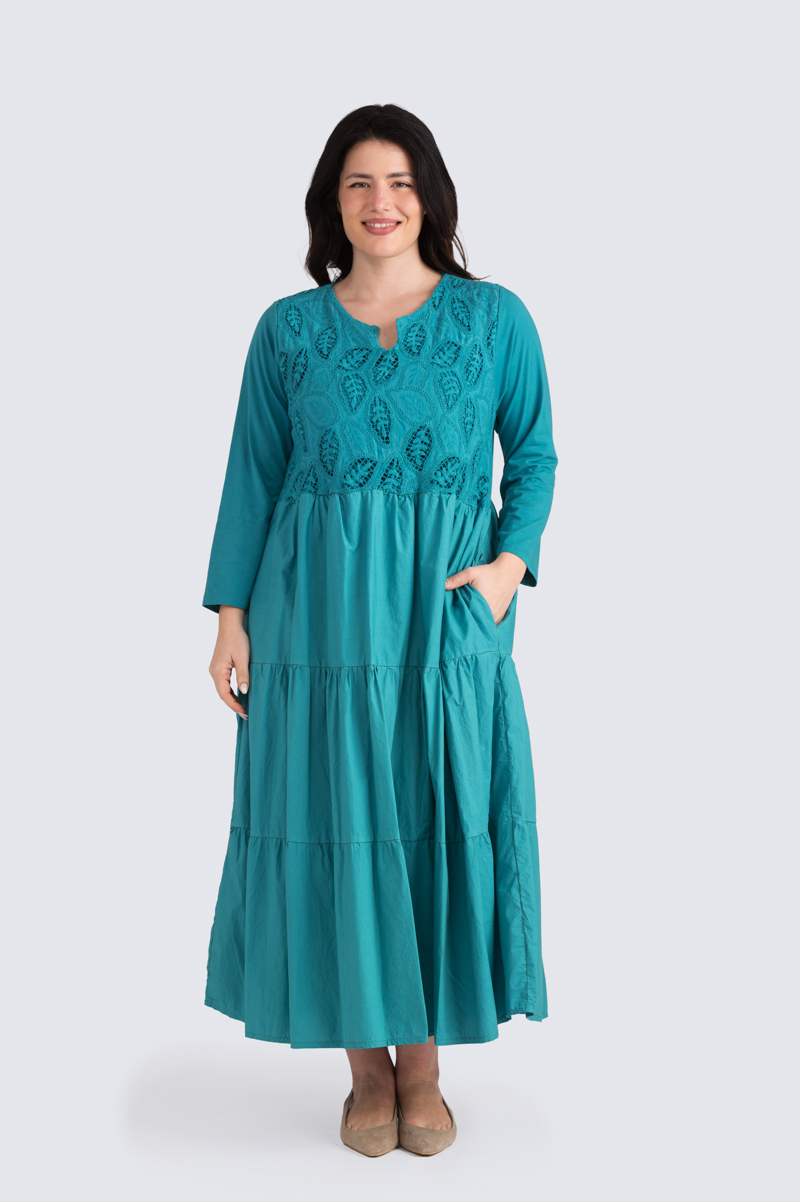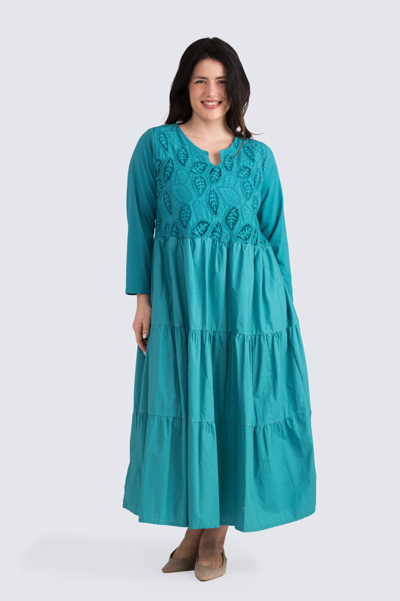Yläosan, koristeelliset pitsibrodeeraukset tuovat mekkoon ilmettä ja yksilöllistä viehätystä. Pehmeä ja joustava trikoinen selkäosa ja trikoiset hihat tuovat lisämukavuutta Helman leikkaus lisää keveyttä ja elävyyttä kokonaisuuteen. Materiaalina kevyt ja hengittävä puuvilla, joka tuntuu miellyttävältä yllä koko päivän ajan.