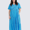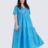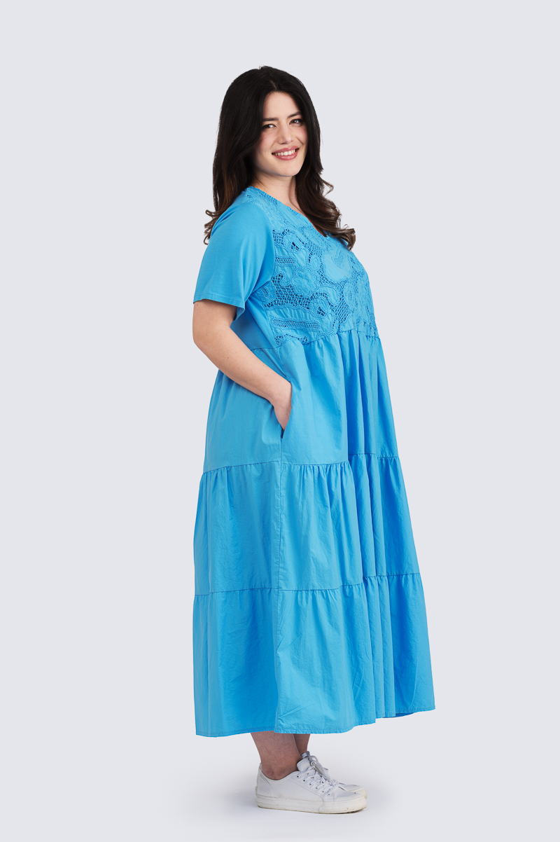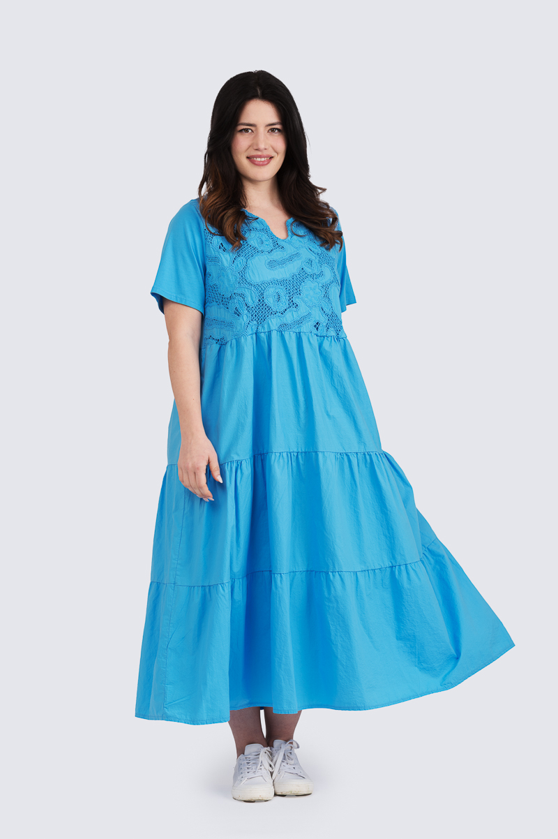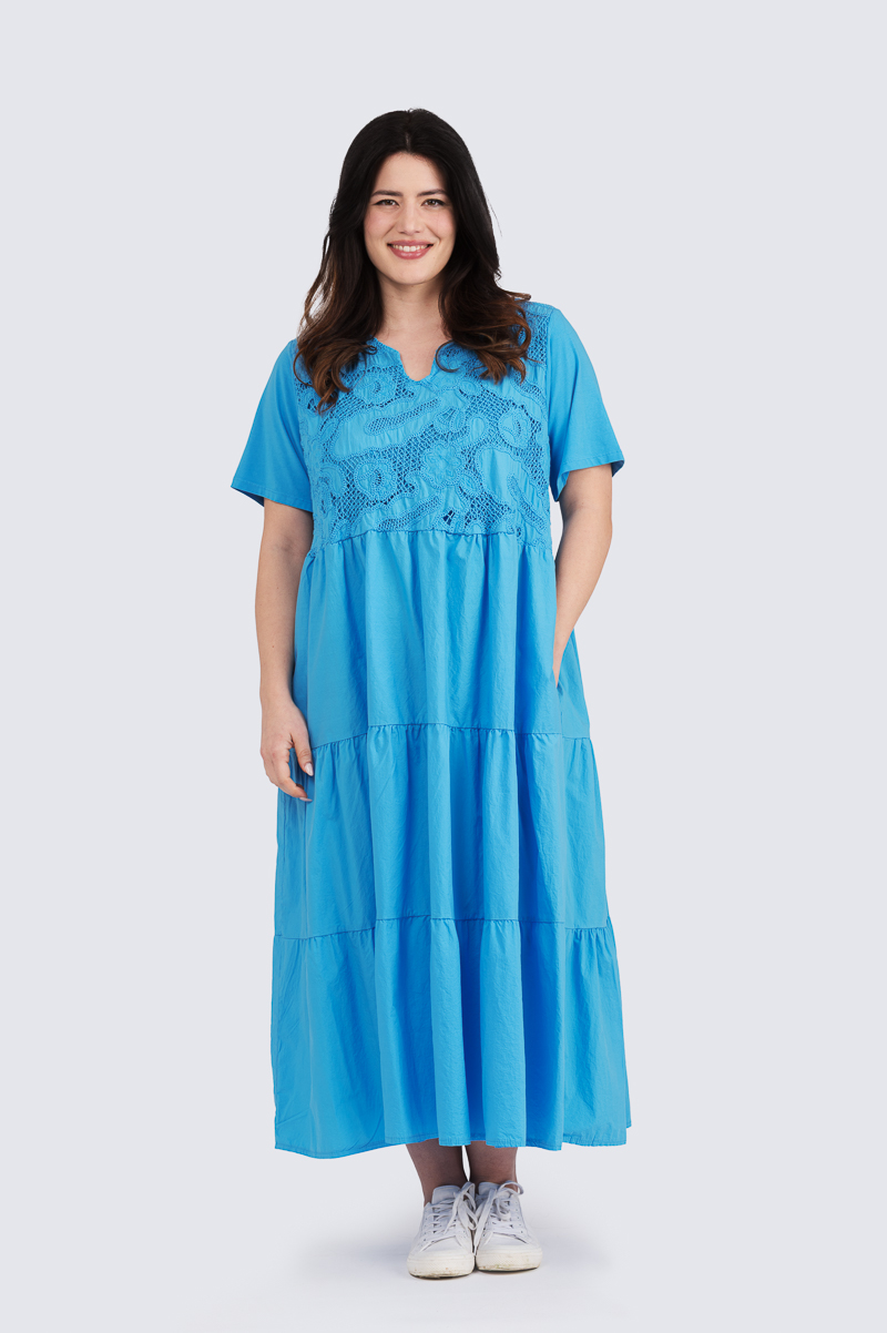 Yläosan, koristeelliset pitsibrodeeraukset tuovat mekkoon ilmettä ja yksilöllistä viehätystä. Pehmeä ja joustava trikoinen selkäosa ja trikoiset hihat tuovat lisämukavuutta Helman leikkaus lisää keveyttä ja elävyyttä kokonaisuuteen. Materiaalina kevyt ja hengittävä puuvilla, joka tuntuu miellyttävältä yllä koko päivän ajan.