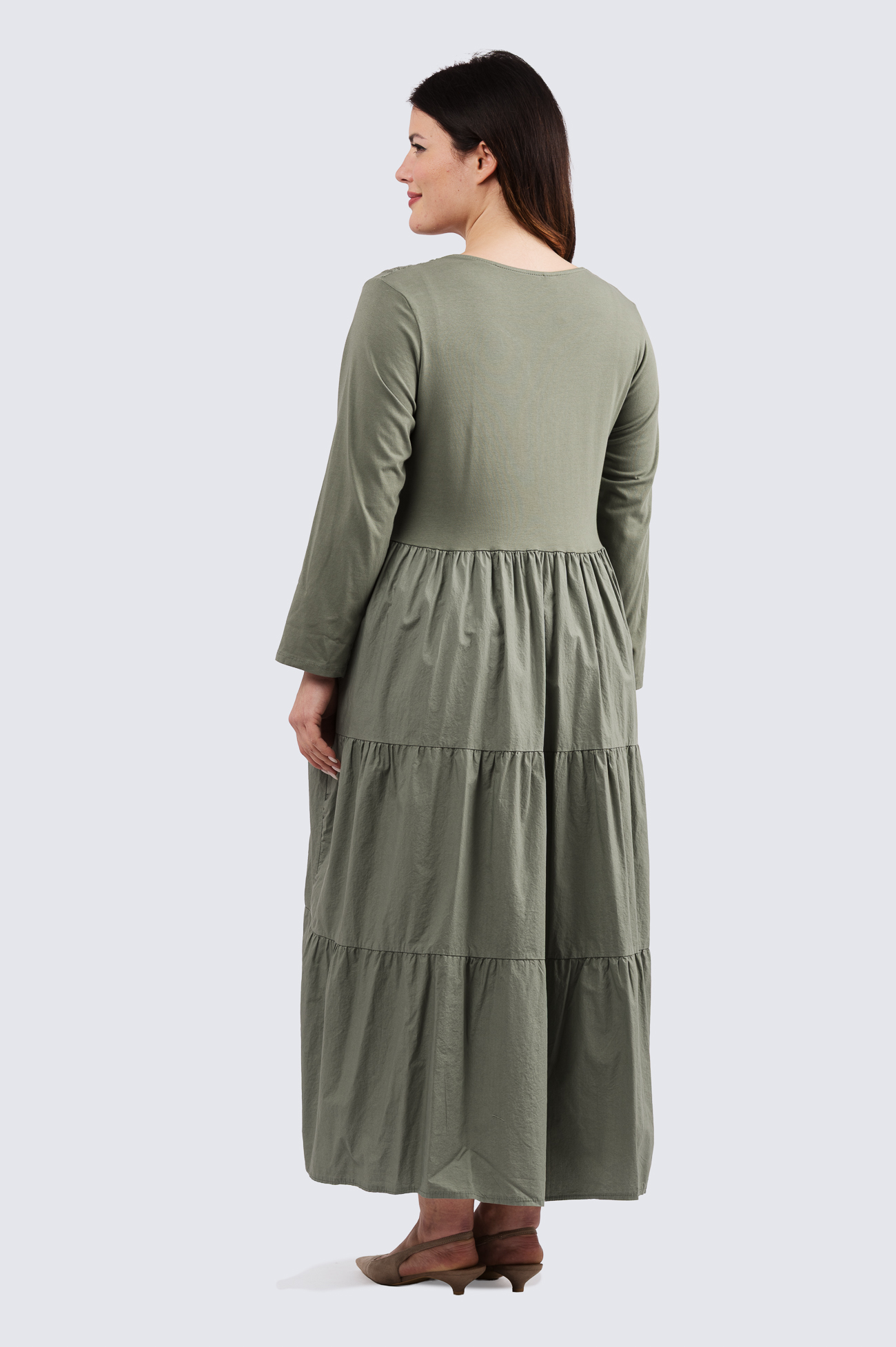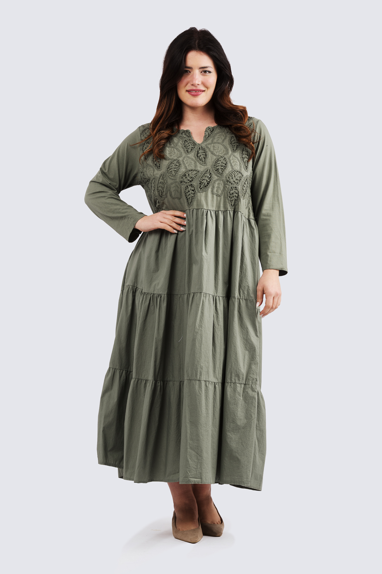 Yläosan, koristeelliset pitsibrodeeraukset tuovat mekkoon ilmettä ja yksilöllistä viehätystä. Pehmeä ja joustava trikoinen selkäosa ja trikoiset hihat tuovat lisämukavuutta Helman leikkaus lisää keveyttä ja elävyyttä kokonaisuuteen. Materiaalina kevyt ja hengittävä puuvilla, joka tuntuu miellyttävältä yllä koko päivän ajan.