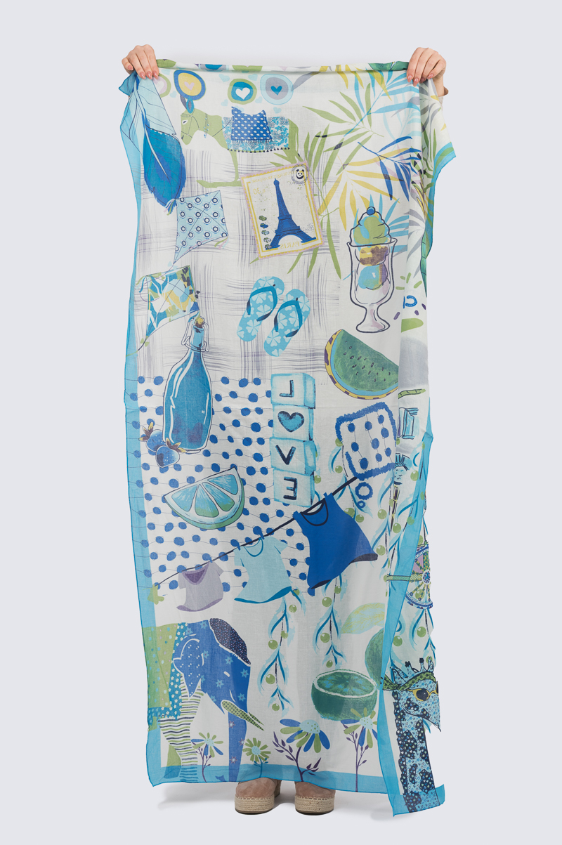 Iloisilla aiheilla kuvioitu leikkisä huivi on täydellinen lisä asustevalikoimaasi.