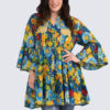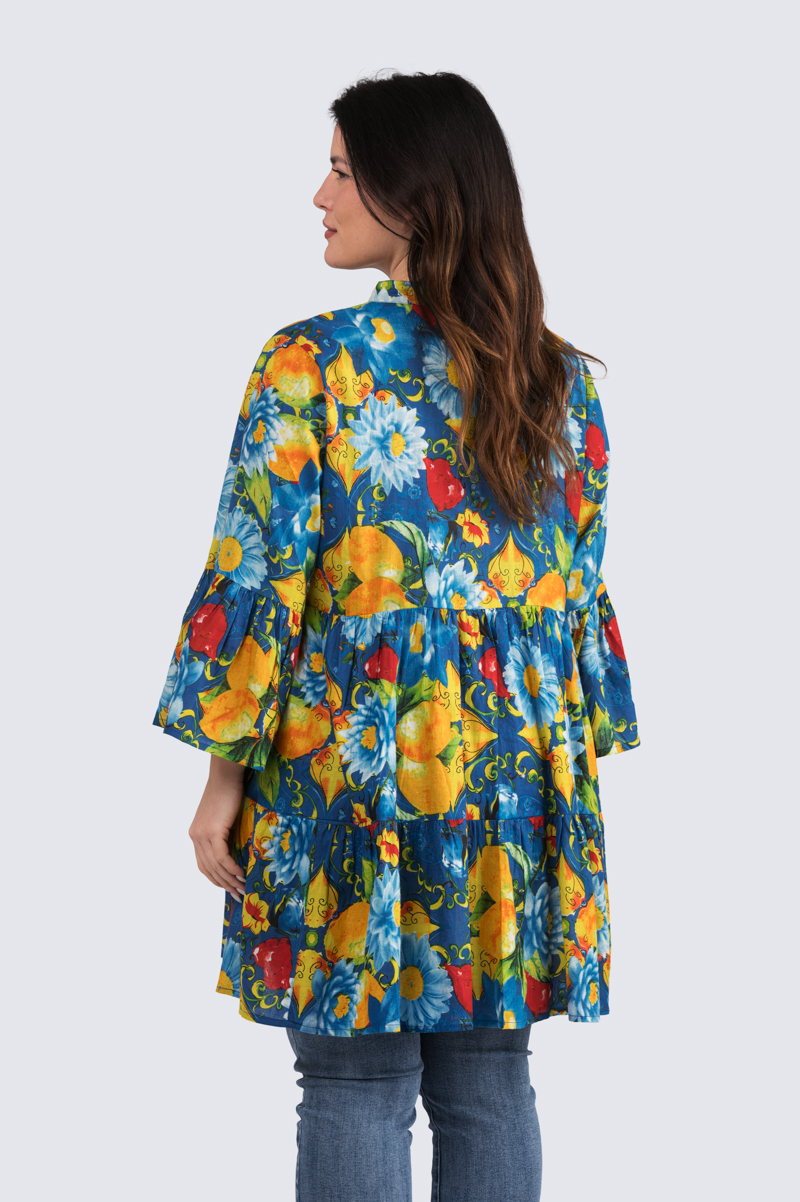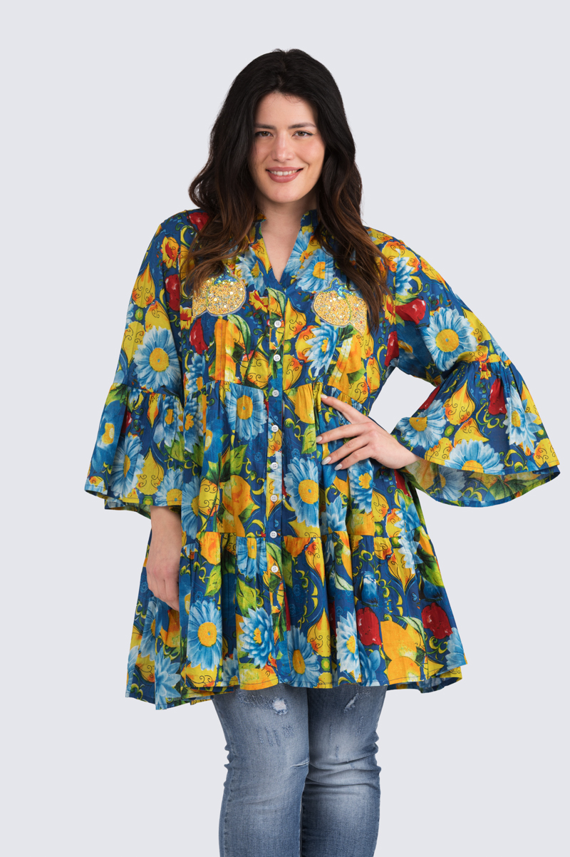 Alas saakka avattava tunika,, jossa huolitellut laskokset edessä, sekä helmin ja paljetein kirjaillut sitruunat