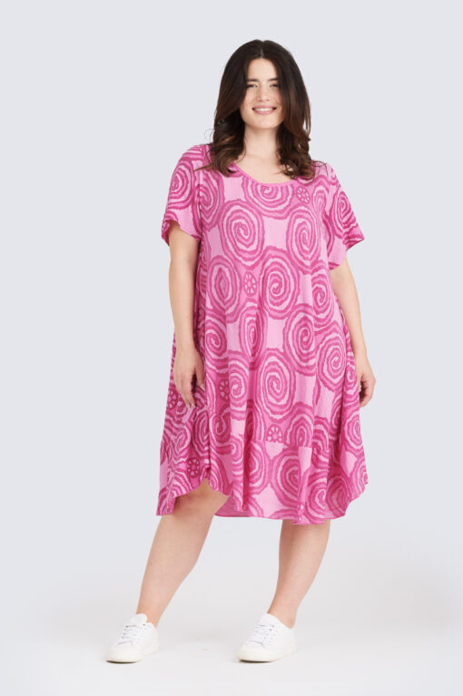 Kepeä, värikäs ja mukava – Kesäspiraali viskoosimekko tuo arkeesi iloa ja huolettomuutta. Näyttävä spiraaliprintti vangitsee katseet, ja hengittävä 100 % viskoosi tuntuu miellyttävältä myös lämpiminä kesäpäivinä.