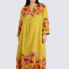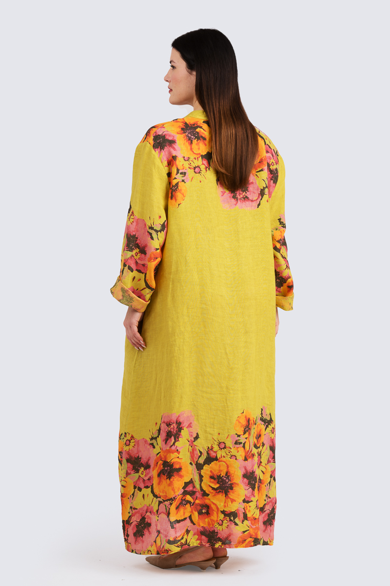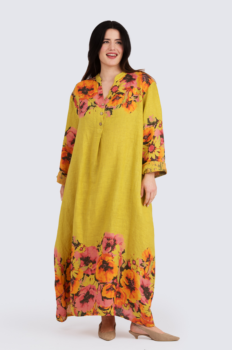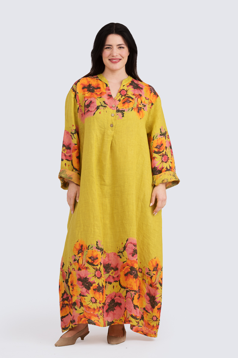 Kauniisti kuvioidussa pellavamekossa on pitkät hihat ja täyspitkä helma, ja se sopii täydellisesti kaikkiin vuodenaikoihin! A-linjaisen mekon käyttömukavuutta lisäävät reilumman mitoituksen lisäksi tilava kainaloaukko sekä etuosan vekki, joka tuo mekkoon tilaa ja liikkumavaraa. Monipuolisuutta ja rentoutta lisäävät sivuilta löytyvät taskut. Kauniissa V-aukkoisessa pääntiessä on pystykaulukset ja edessä sirot kookosnapit.