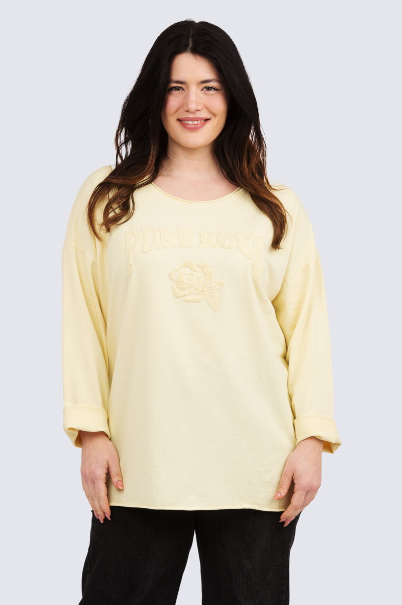 Mukavan pehmeä trikootunika. “Pure rose” teksti ja ruusu on kirjailtu sävysvävyyn.