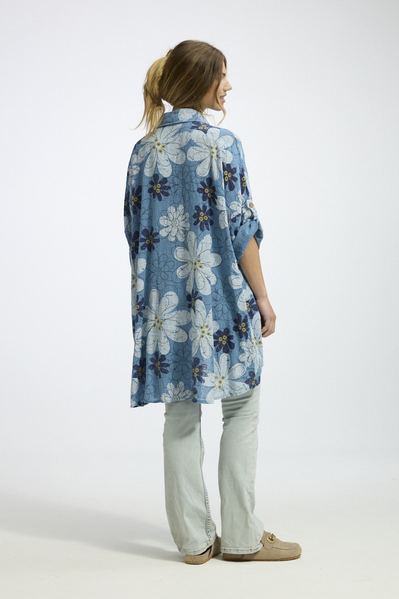 Tässä puuvillaisessa pitkässä paitiksessa yhdistyvät mukavuus, tyyli ja graafinen kukkakuosi. 3/4-hihat tamppeineen tuovat käytännöllisyyttä, ja pyöristetty helma luo pehmeän, huolettoman ilmeen. Täyspitkän nappilistan ansiosta voit stailata paidan lukemattomilla tavoilla – napitettuna puseroksi, tunikana housujen kanssa tai rennosti auki topin päällä. Täydellinen kesän luottovaate! 🌼