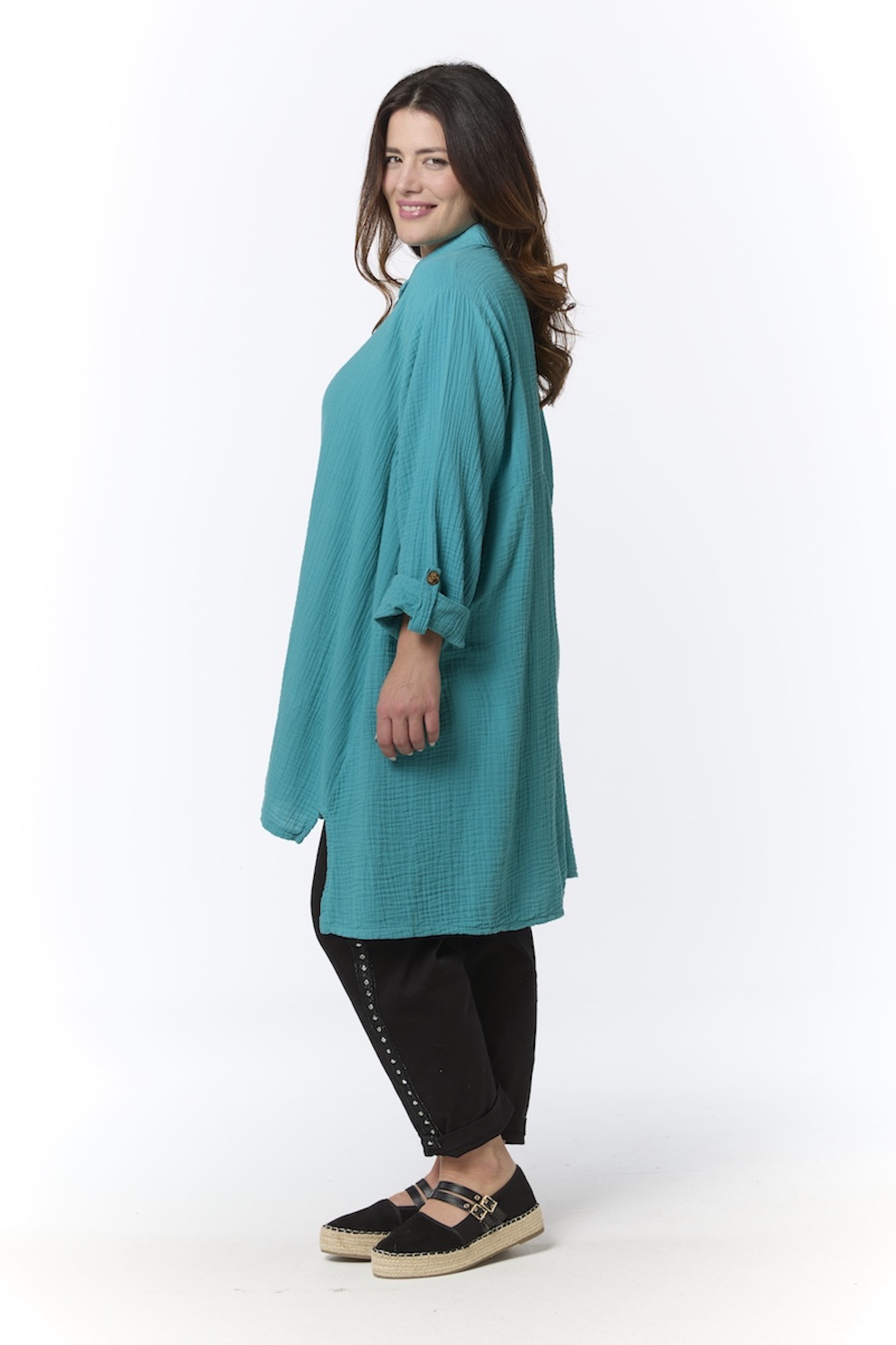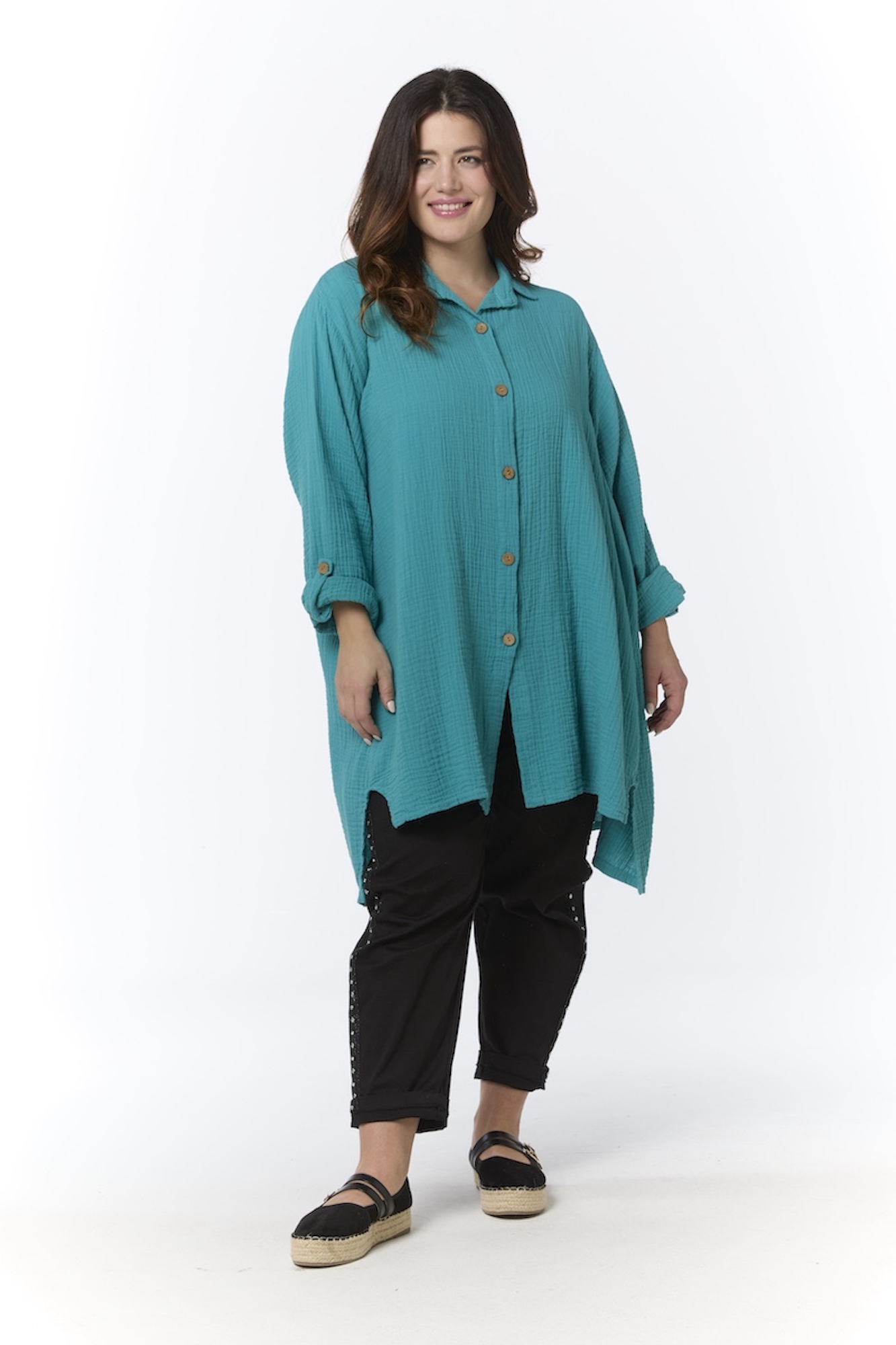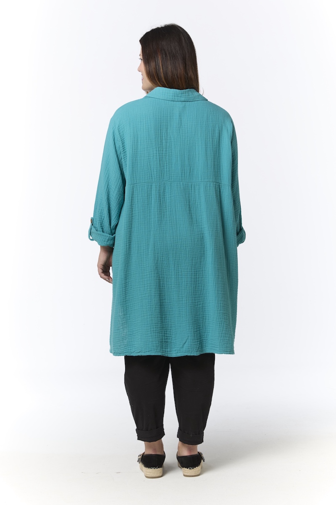 Monipuolinen pitkä pehmeä puuvillapaitis, kankaan pinta on eläväinen ja kuohkea. 3/4-hihat ja tampit, joiden avulla säädät hihan pituutta. Käytä klassisesti puserona tai jätä rennosti auki mieleisesi topin kera. Jadenvihreä upea sävy