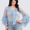 Ohut pitsipusero näyttävillä röyhelöillä. Puserossa on v-aukko.