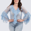 Ohut pitsipusero näyttävillä röyhelöillä. Puserossa on v-aukko.