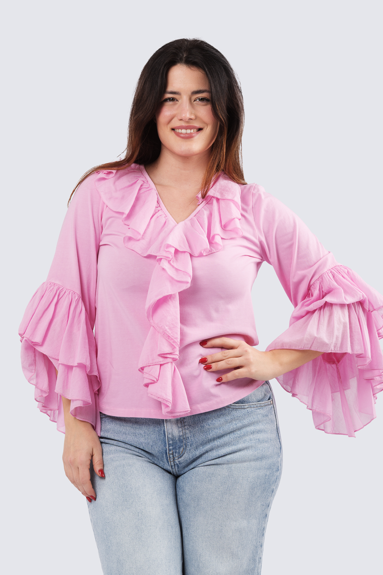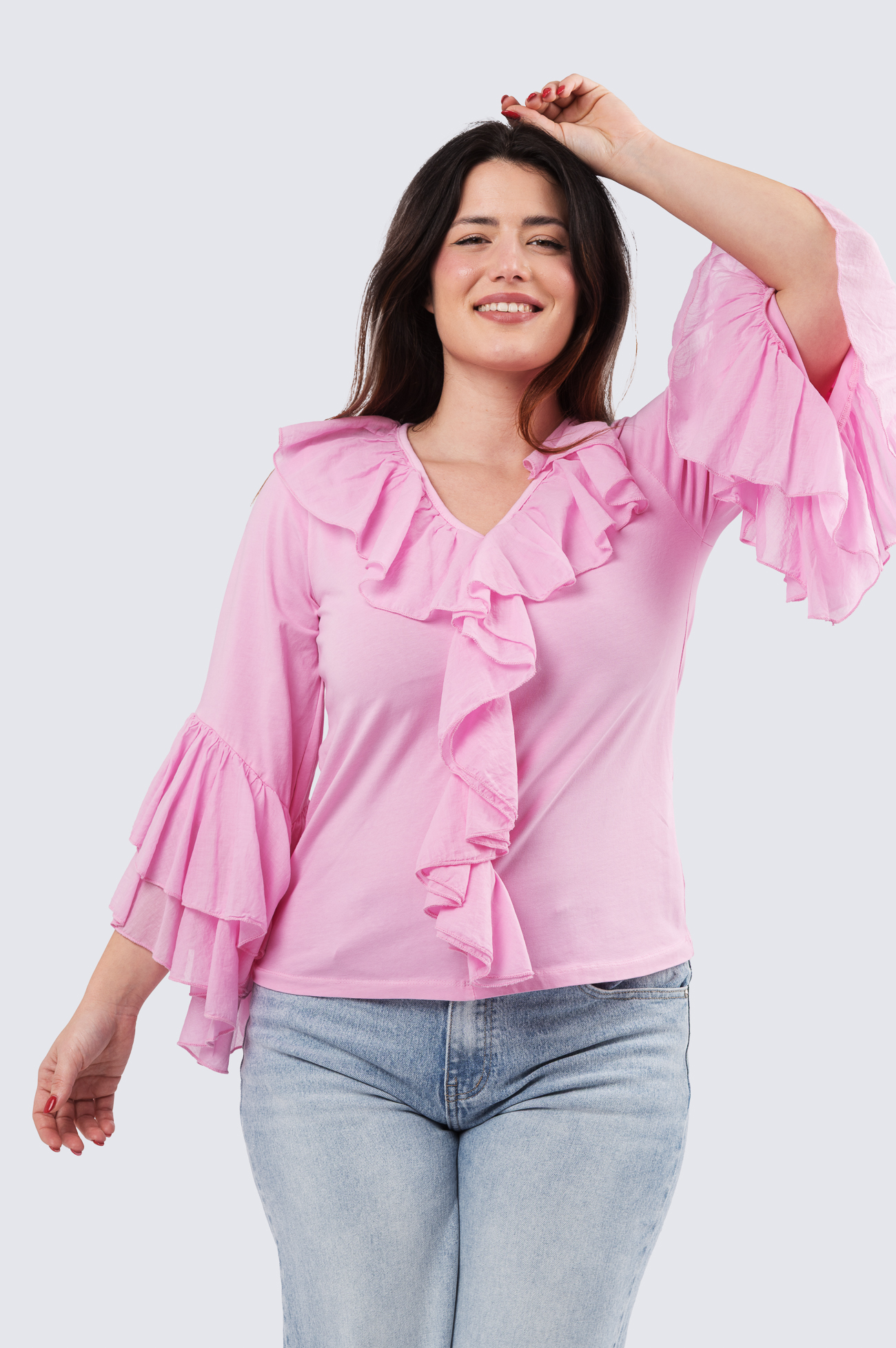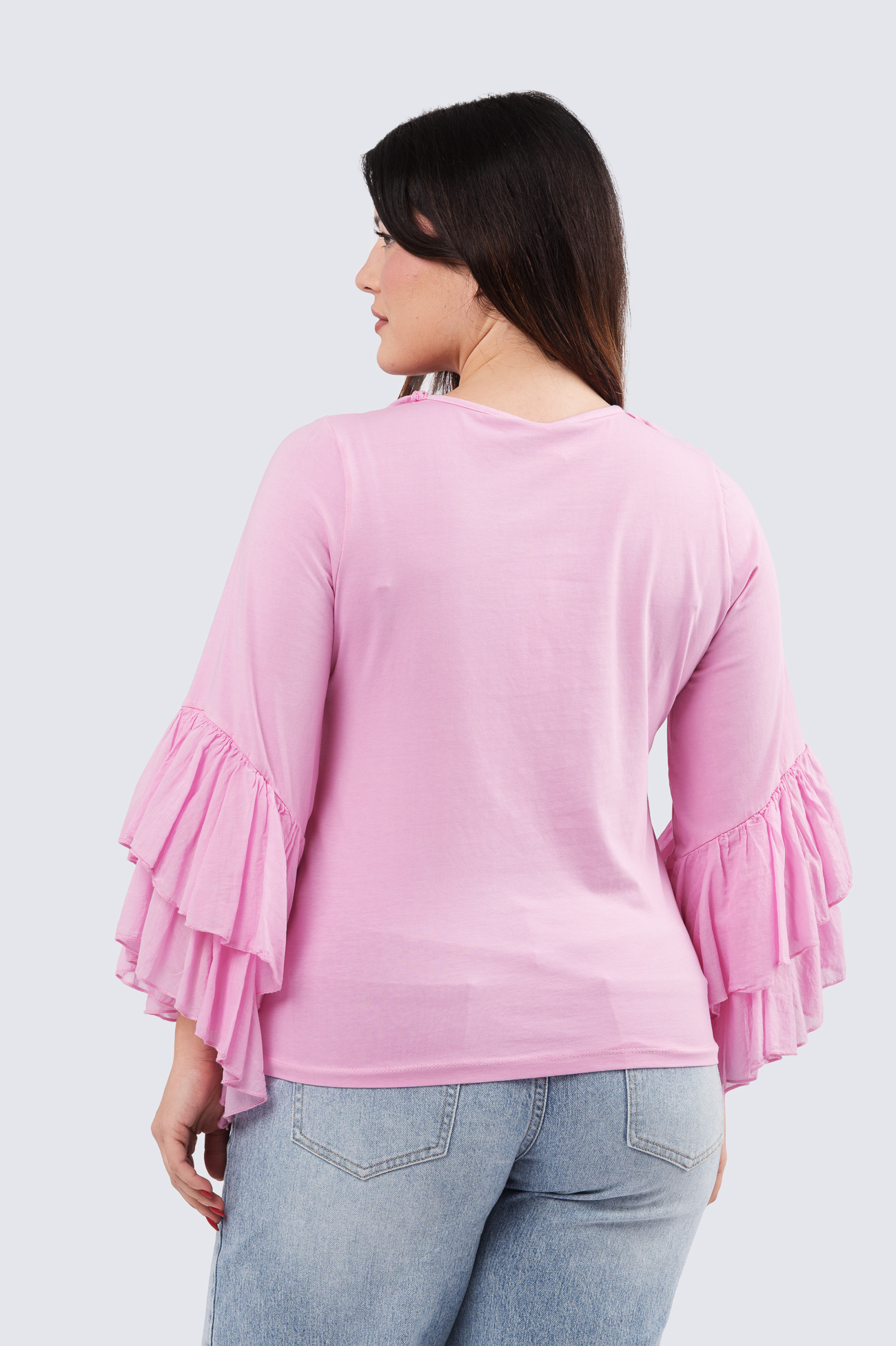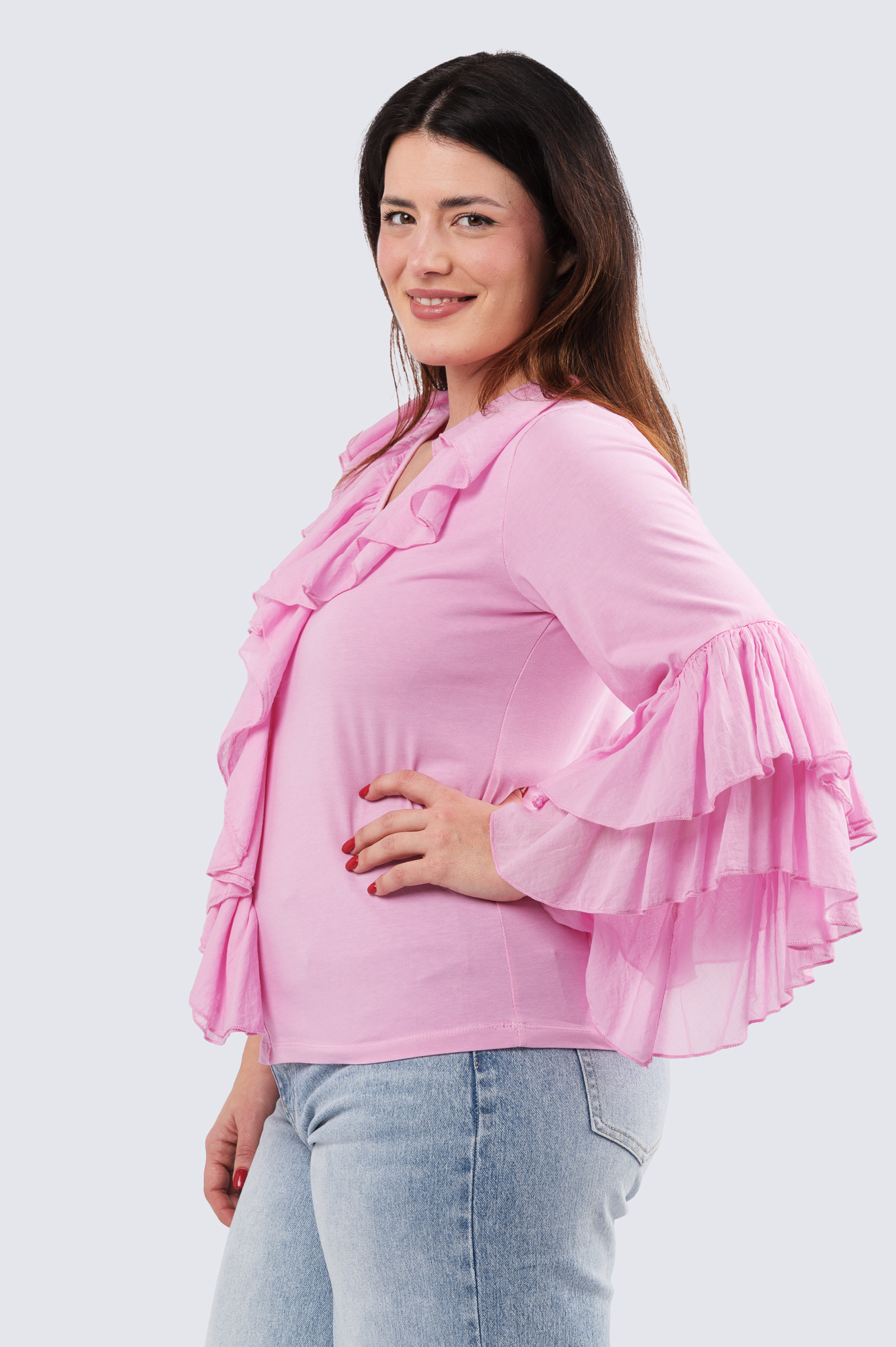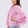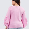 Kevyt trikoopusero kankaisilla rimpsuilla. Tässä puserossa on hurmaavaa runsautta ja naisellisuutta.