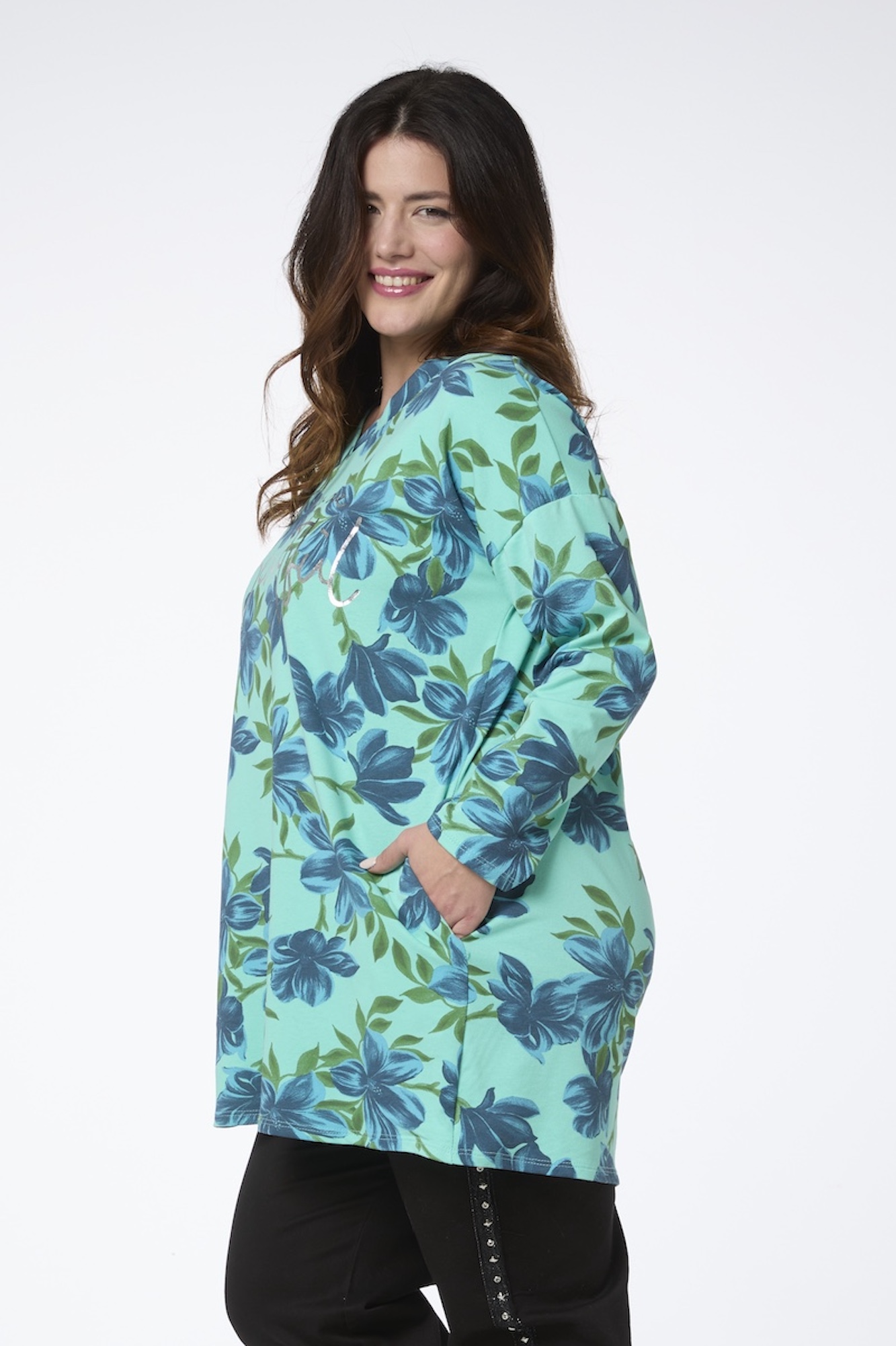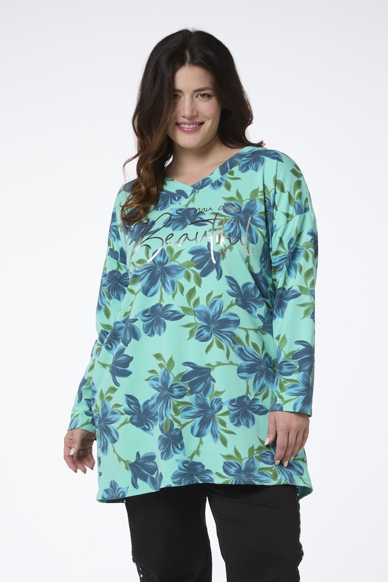 Napakka collegetunika kukkakuosilla. V-aukko, sivusaumoissa taskut ja edessä hennosti hopealla teksti: You are beautiful