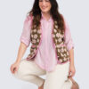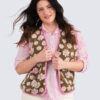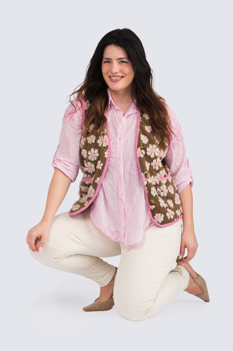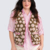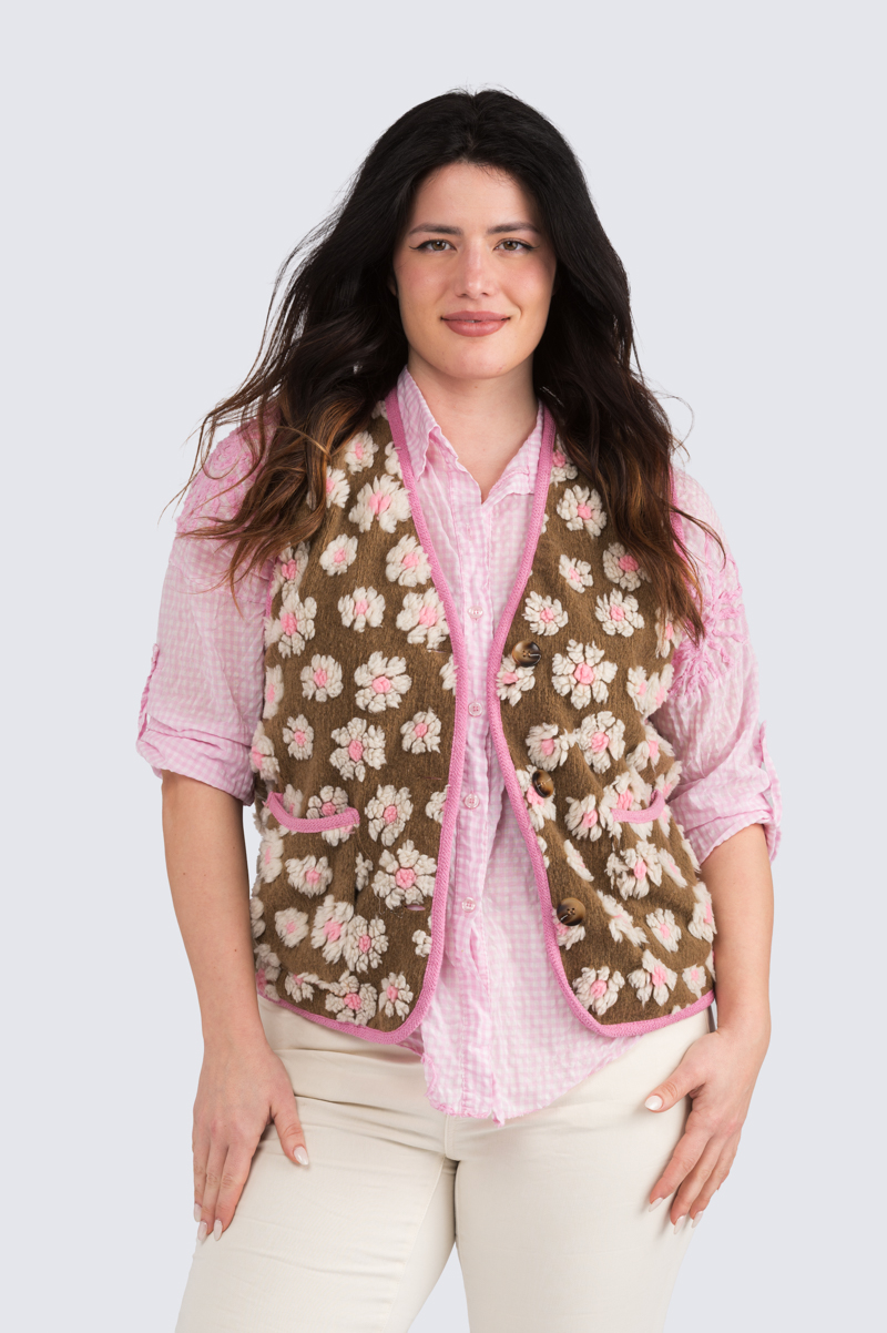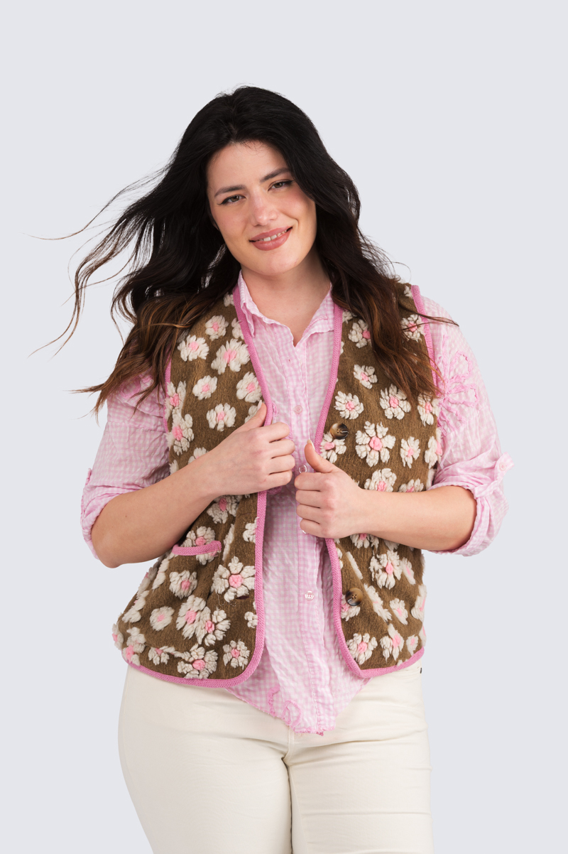Vuorellinen, kauniisti viimeistelty kukkaliivi. Huopamainen kangas, jossa koholla kukkakuvioita, edessä taskut.