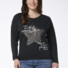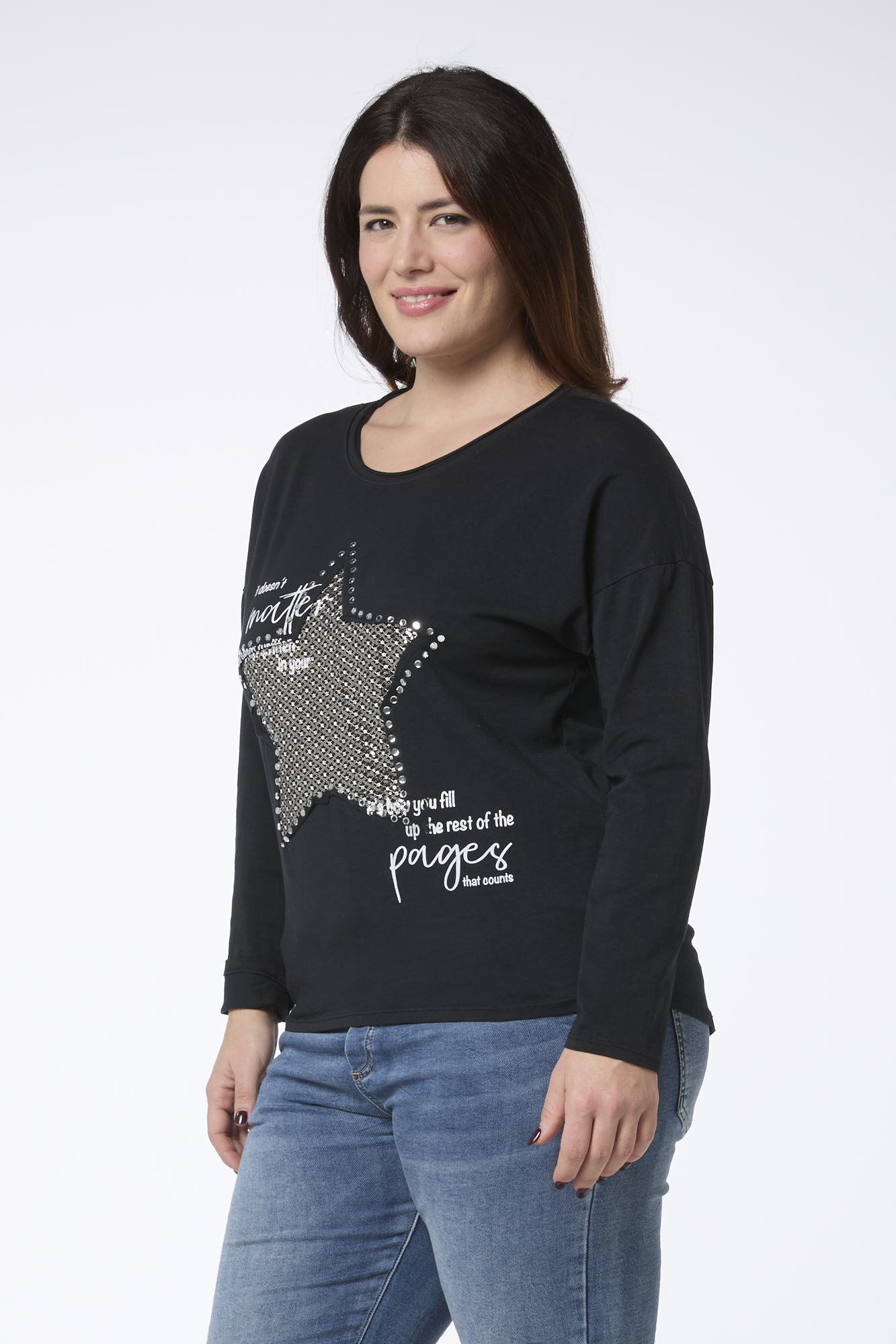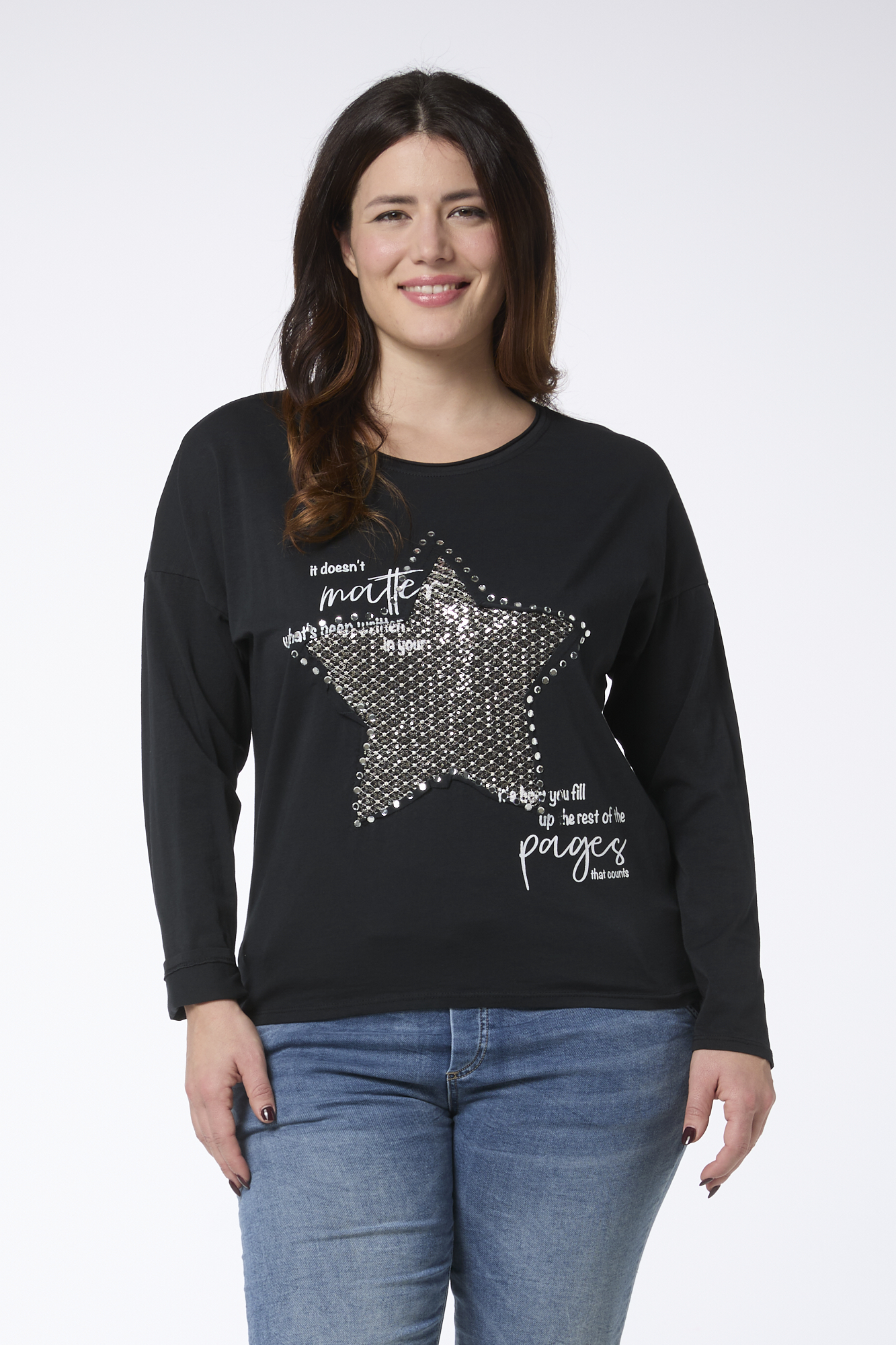 Kevyt pitkähihainen trikoopusero kimaltavalla tähdellä ja valkoisella tekstillä