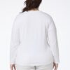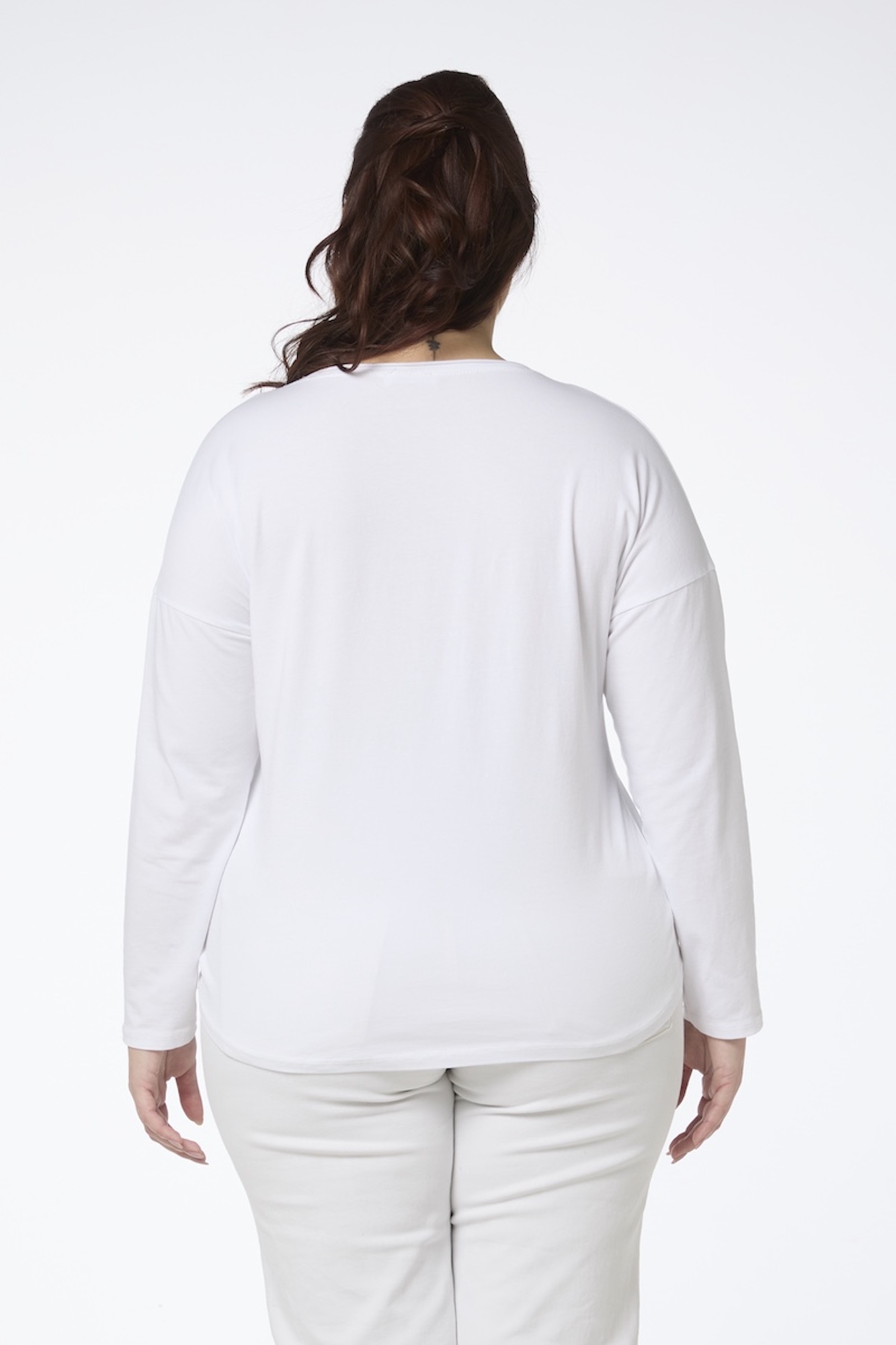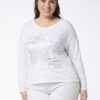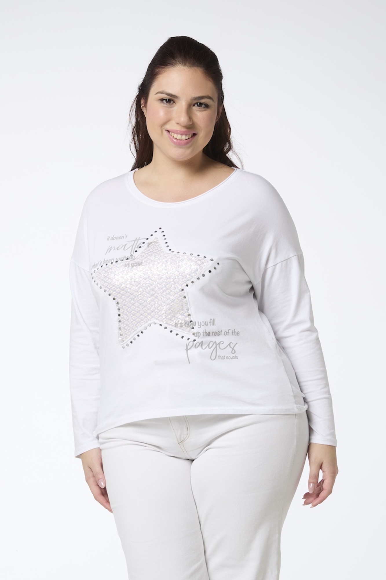 Kevyt pitkähihainen trikoopusero kimaltavalla tähdellä ja hillityllä tekstillä