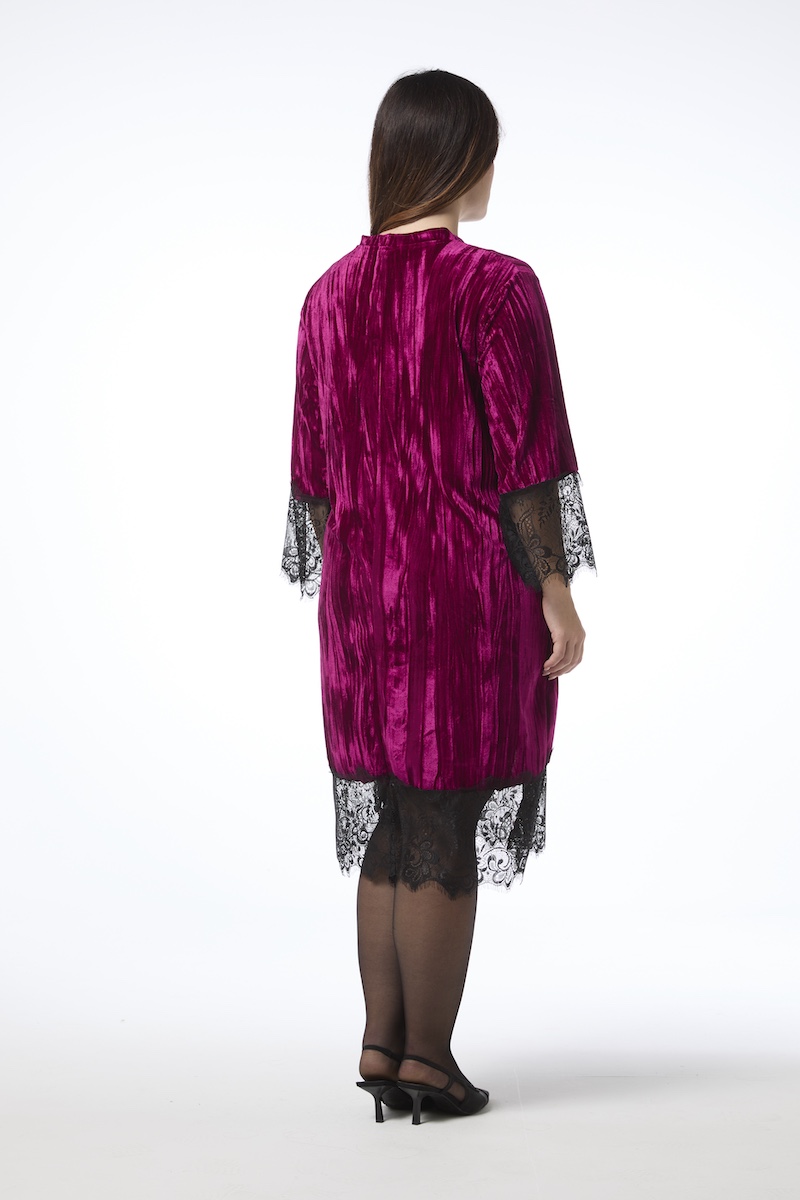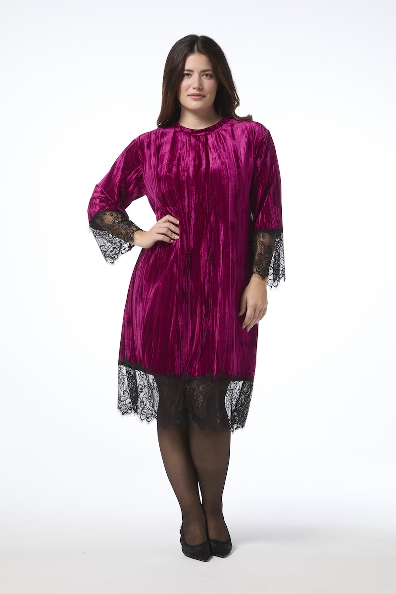 Velvet mekko on upea juhlamekko, joka yhdistää ylellisen eläväisen samettipinnan ja joustavuuden. Mekon helmassa ja hihoissa olevat pitsikoristeet tuovat tyylikästä yksityiskohtaa, kun taas klassinen o-pääntie ja polvipituinen leikkaus luovat elegantin siluetin. Täydellinen valinta juhliin, illanistujaisiin tai erityisiin tilaisuuksiin, jossa mukavuus ja hienostuneisuus kohtaavat.