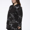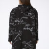 Collegetunika, jossa yksityiskohtana vino avattava vetoketju halkaisee tunikan alaosan. Printattu tekstikuvio.