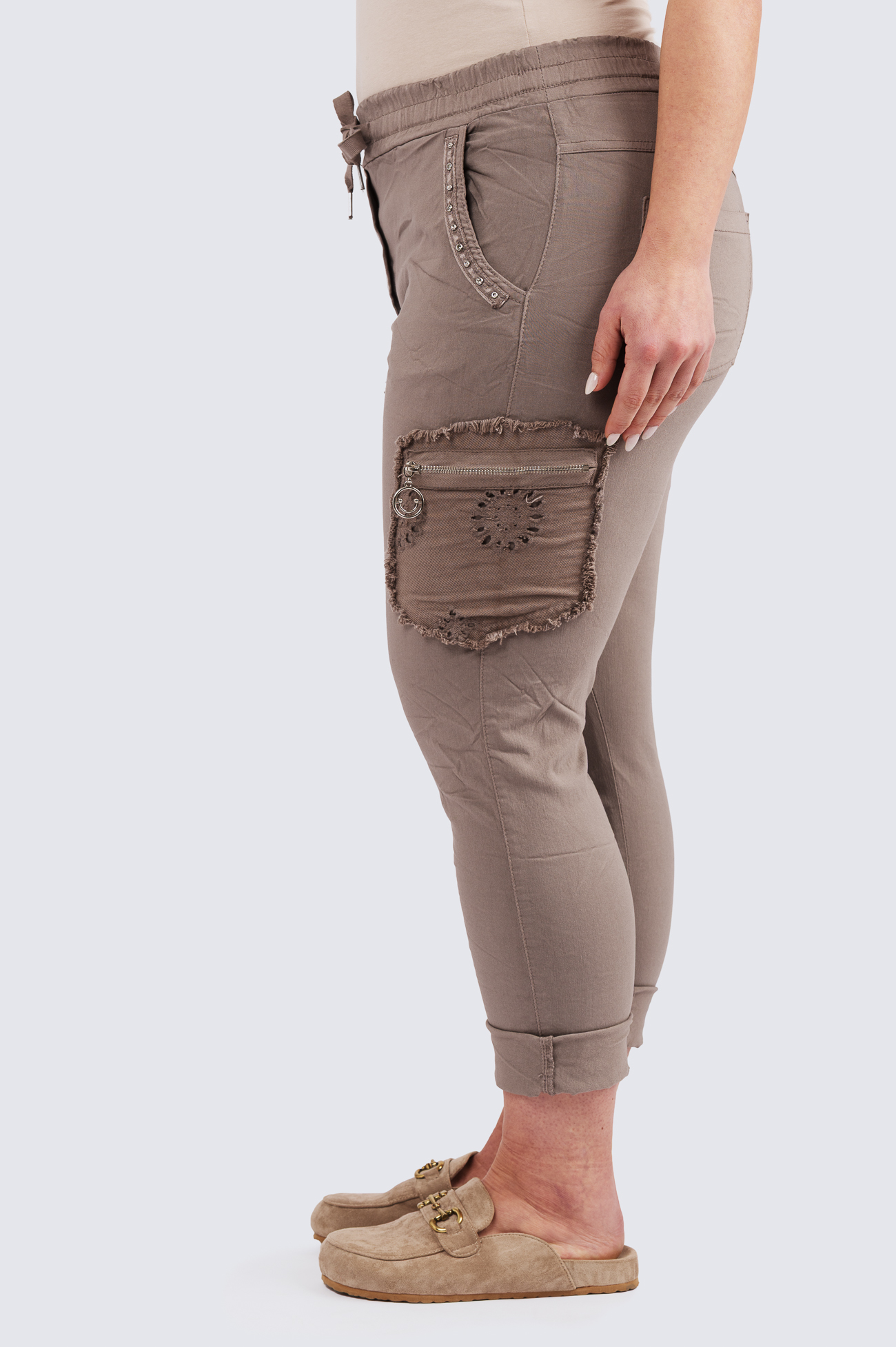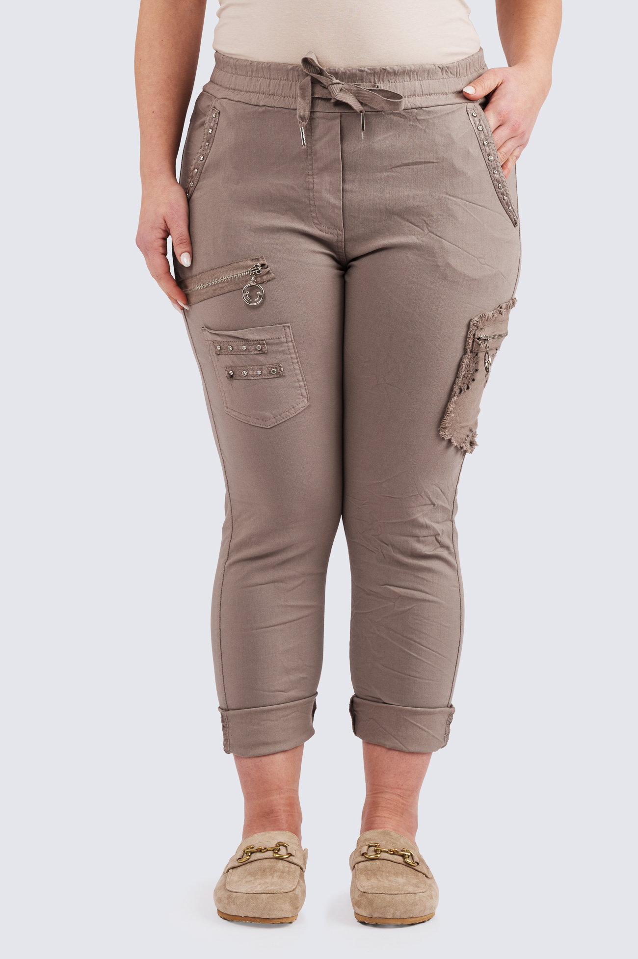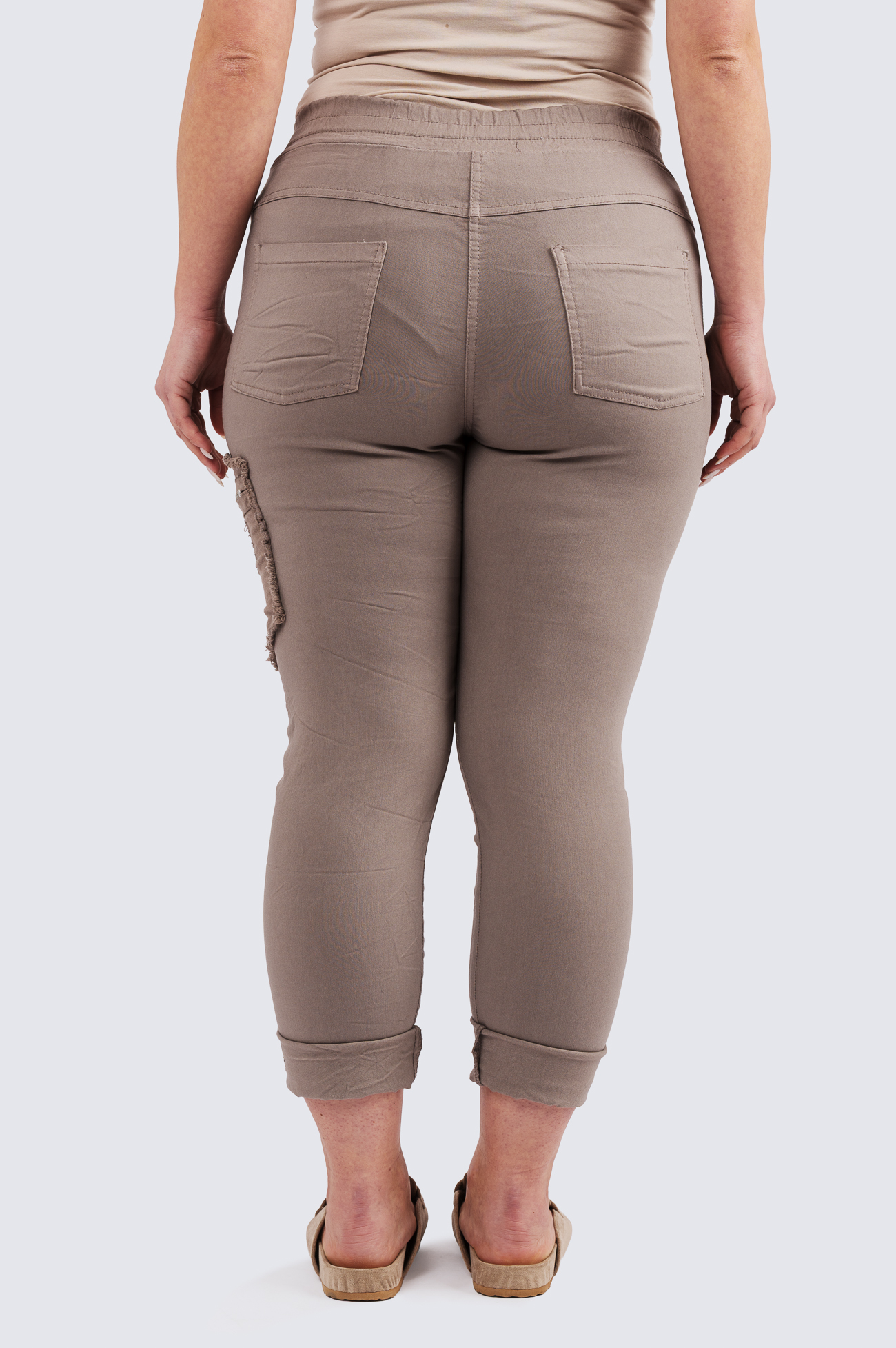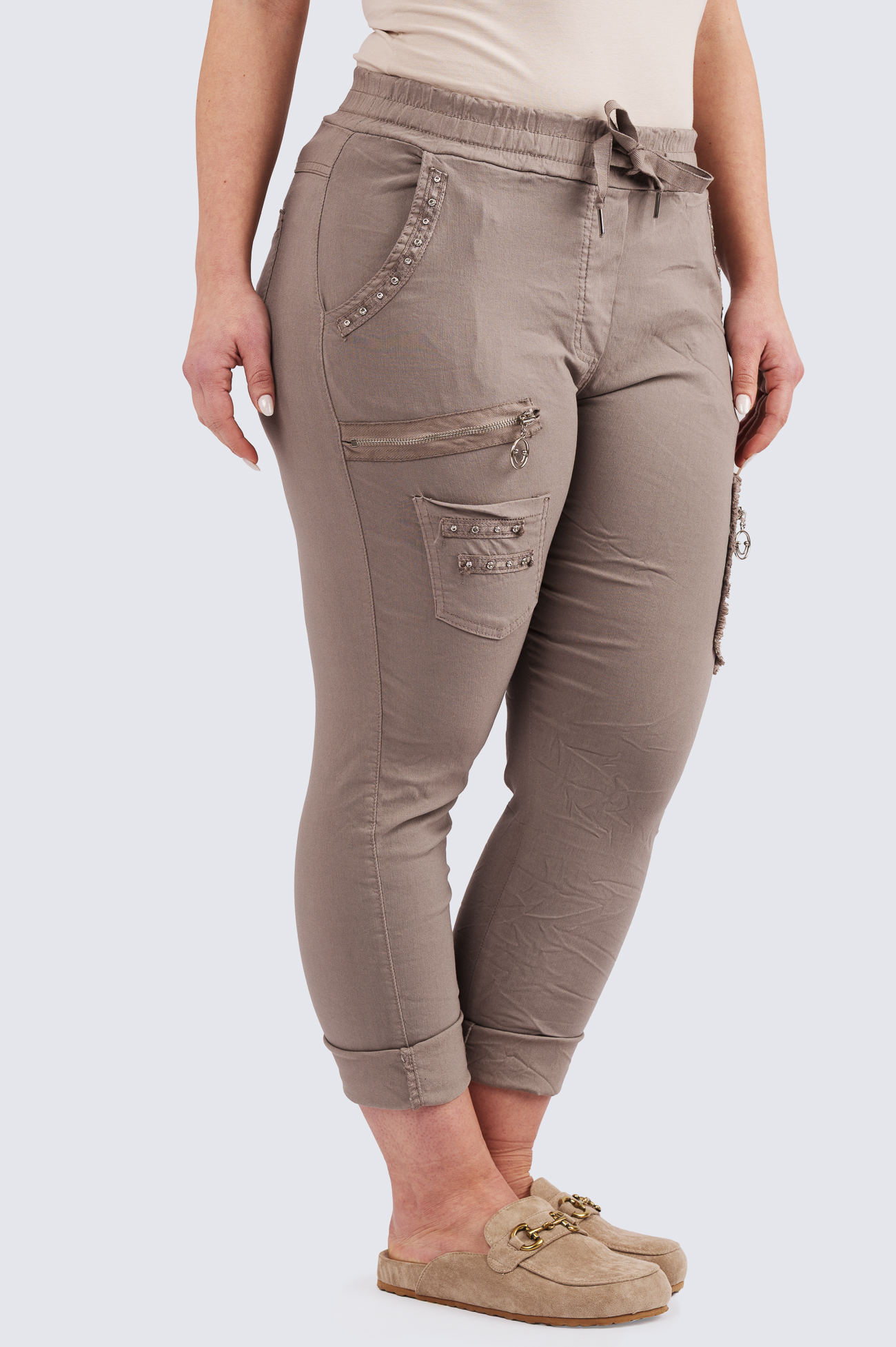 Joustavat housut kuminauhavyötäröllä.
